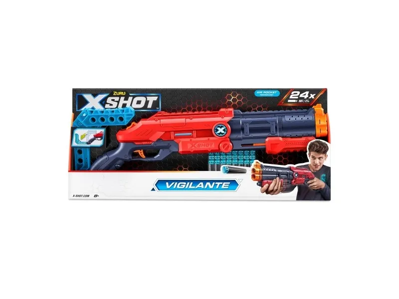 X-Shot Vigilante har tvillingløp, ond stil, pumpehåndtak og en hurtigutskytningsmekanisme som lar deg skyte fra opptil 15 meters avstand!