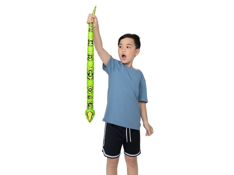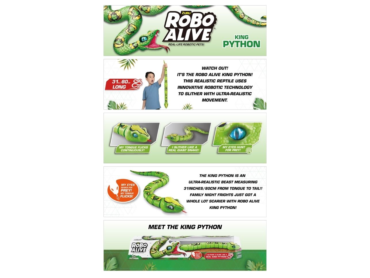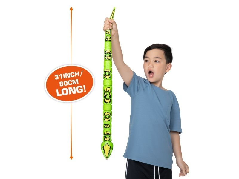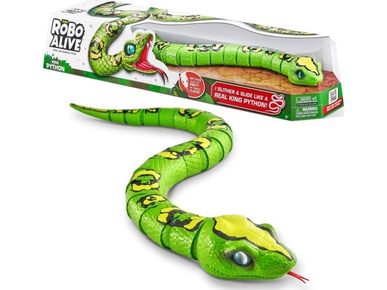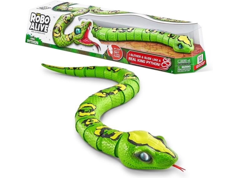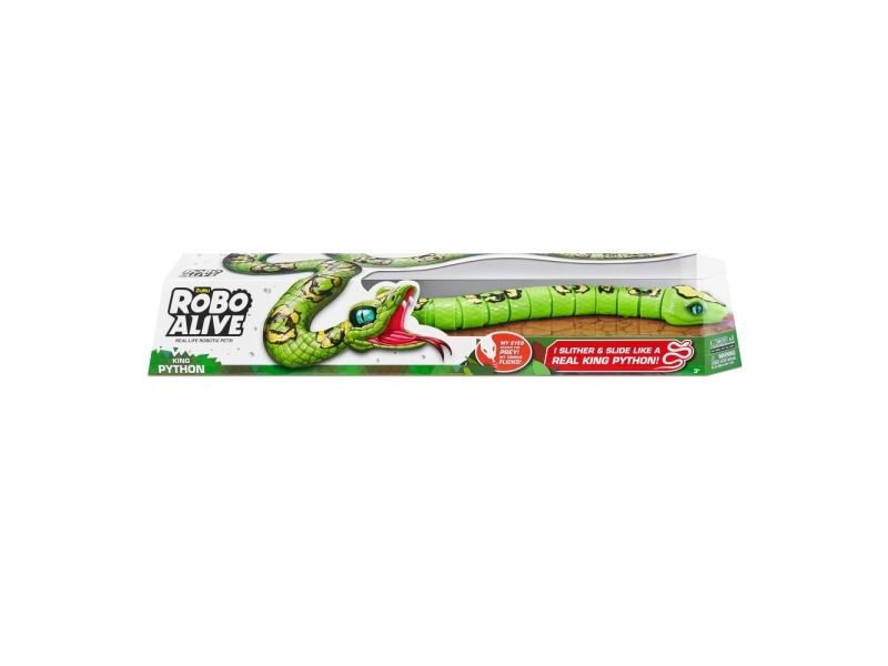 Pass på! Det er Robo Alive King Python! Dette realistiske reptilet bruker innovativ robotteknologi for å gli med ultra-ekte bevegelser. Oppbevar Kongepytonen under spisebordet for å skremme familien, eller snik den inn i en søskens ryggsekk for å skremme på skolen. Kongepytonen er et ultrarealistisk beist som måler 80 cm fra tunge til hale !! Natteskrekk i familien har nettopp blitt mye mer skremmende med Robo Alive Kongepyton!