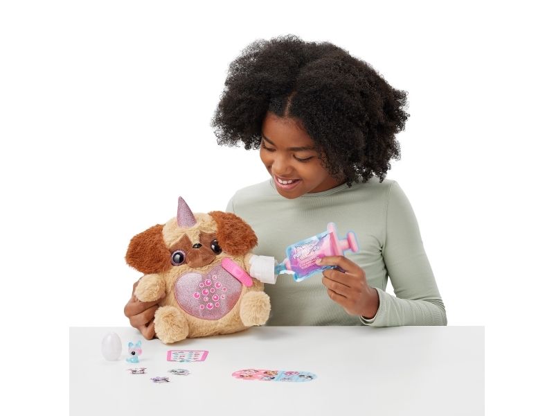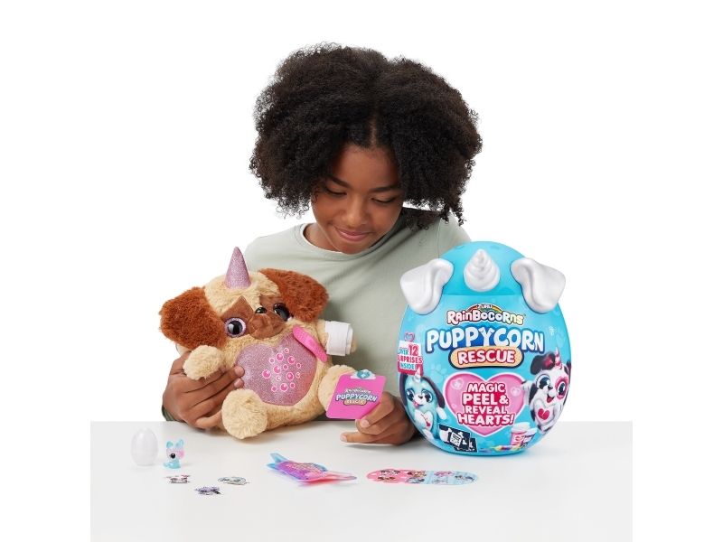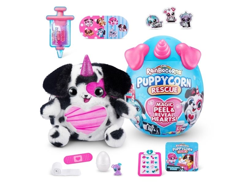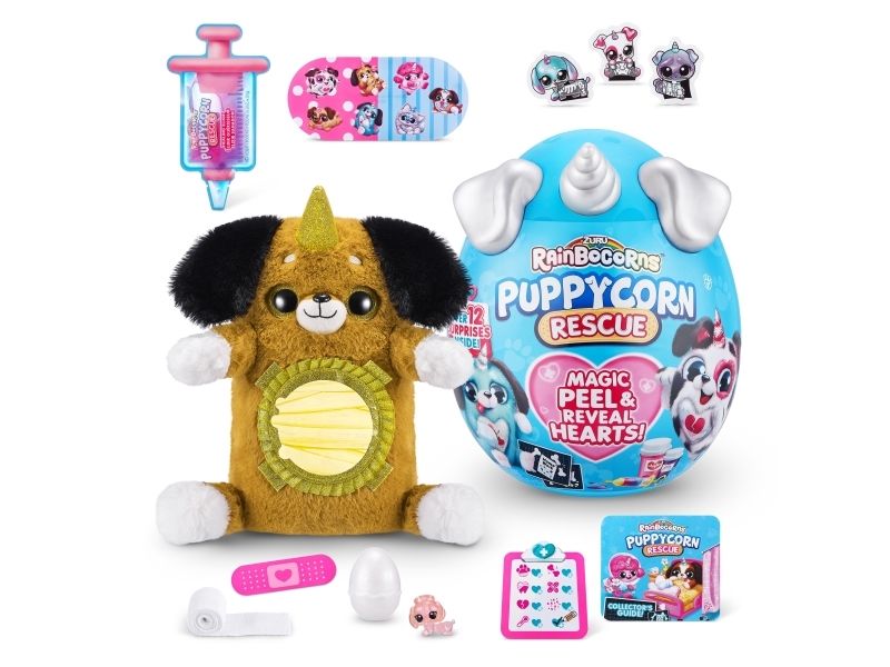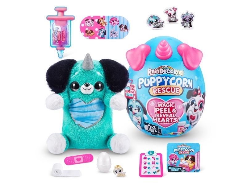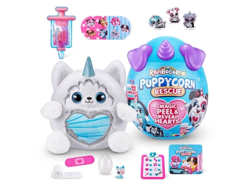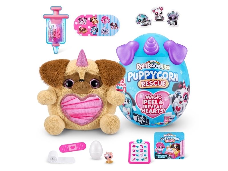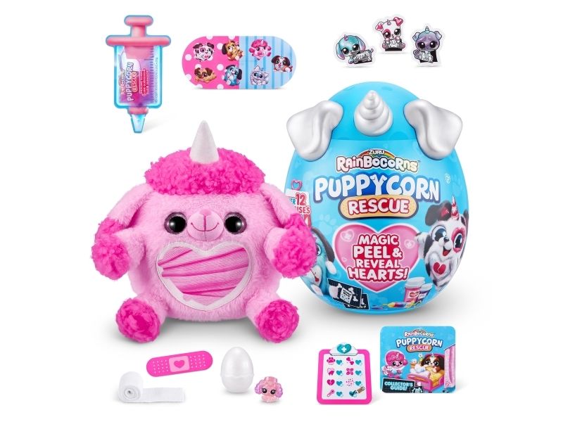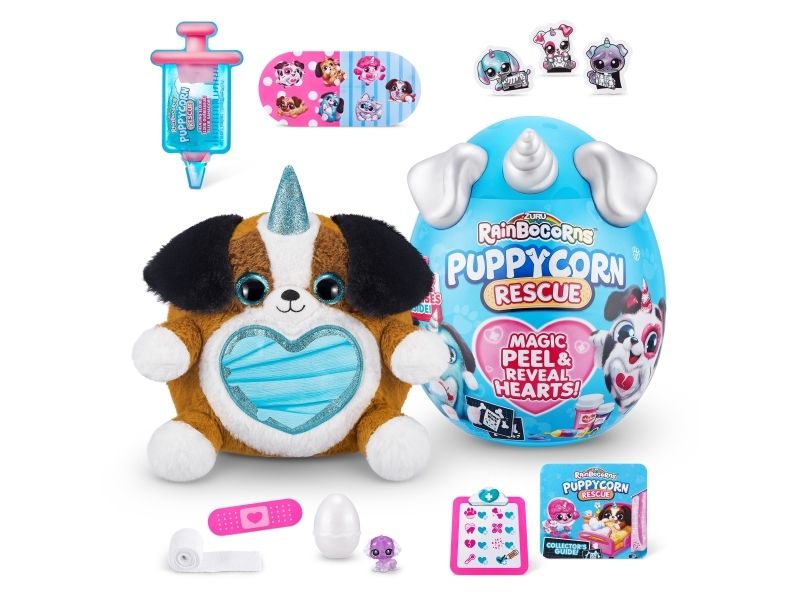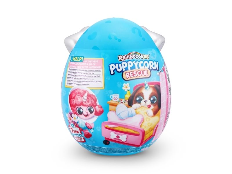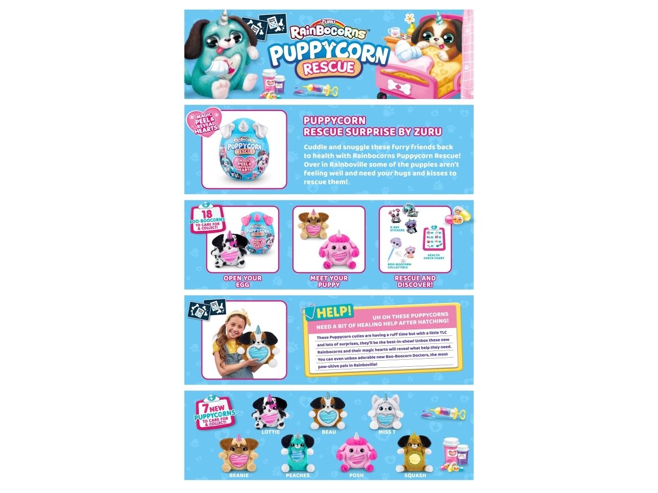 Kos, klem og få disse lodne vennene tilbake til god helse med Rainbocorn's Puppycorn Rescue! Borte i Rainboville føler noen av valpene seg ikke bra og trenger klemmer og kyss for å redde dem! Åpne egget for å finne din Puppycorn-pasient og over 12 magiske overraskelser! Fjern valpehjørnets magiske hjerte for å avsløre hva som har fått den dårlige valpen til å føle seg sløv, og bruk deretter helbredende tilbehør som bandasjer og slimsprøyter for å amme valpehjørnet ditt tilbake til helse. Det er 7 perfekte valpehjørner å samle, hver med en ny Dr Boo-Boocorn og over 12 overraskelser for å hjelpe deg på veien. Hjelp Rainboville med ett kyss og en klem om gangen med Puppycorn Rescue!