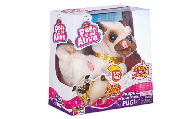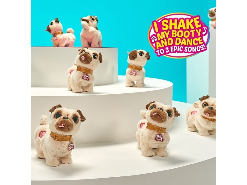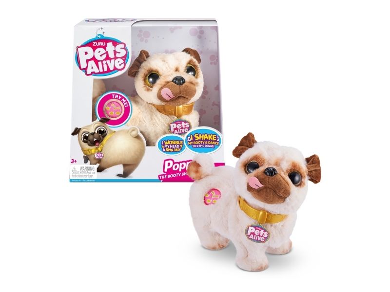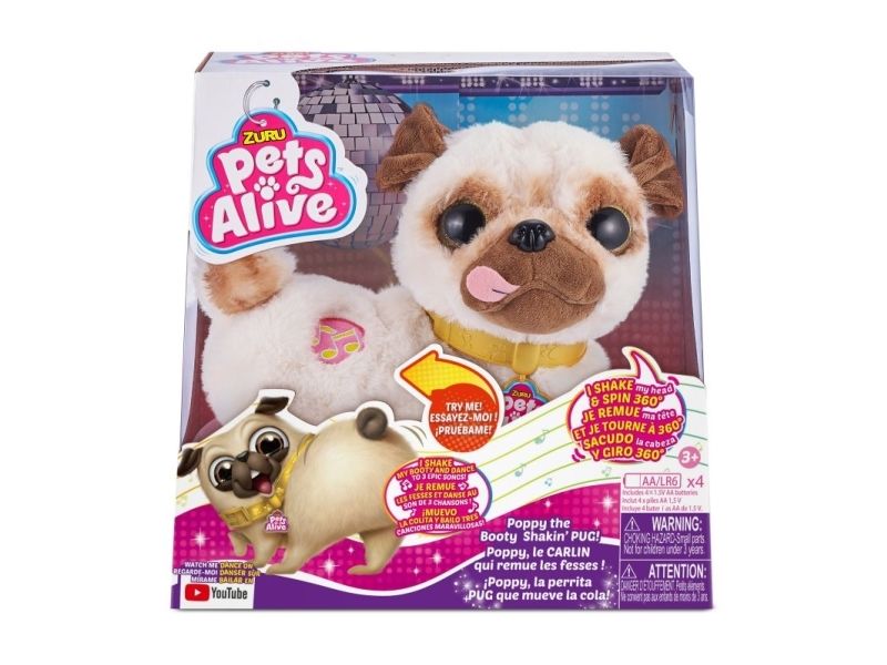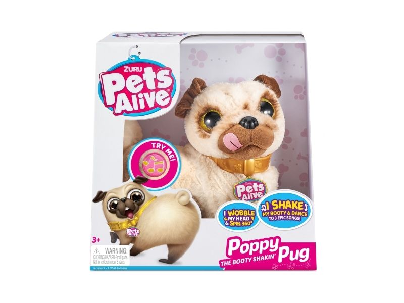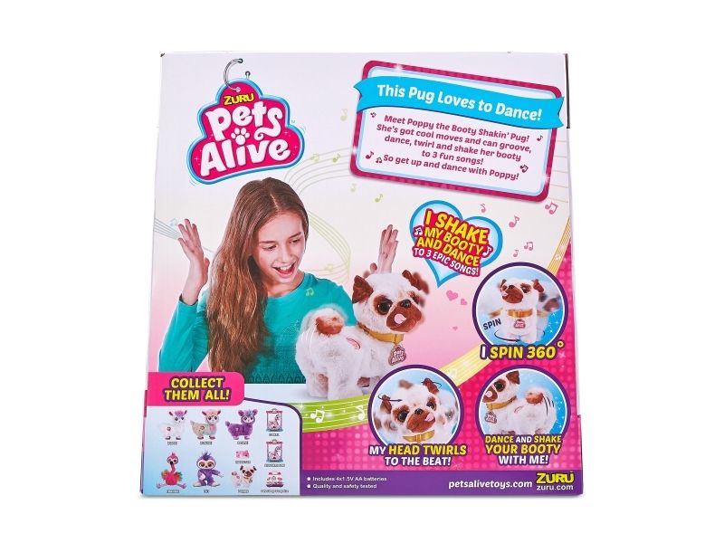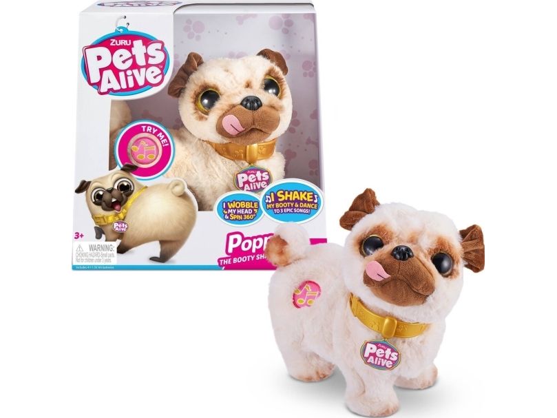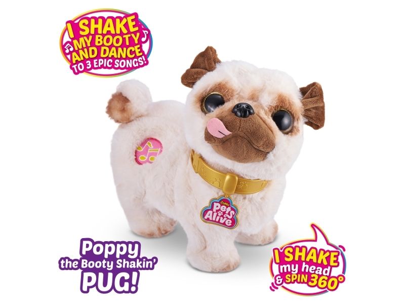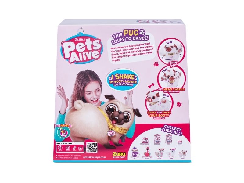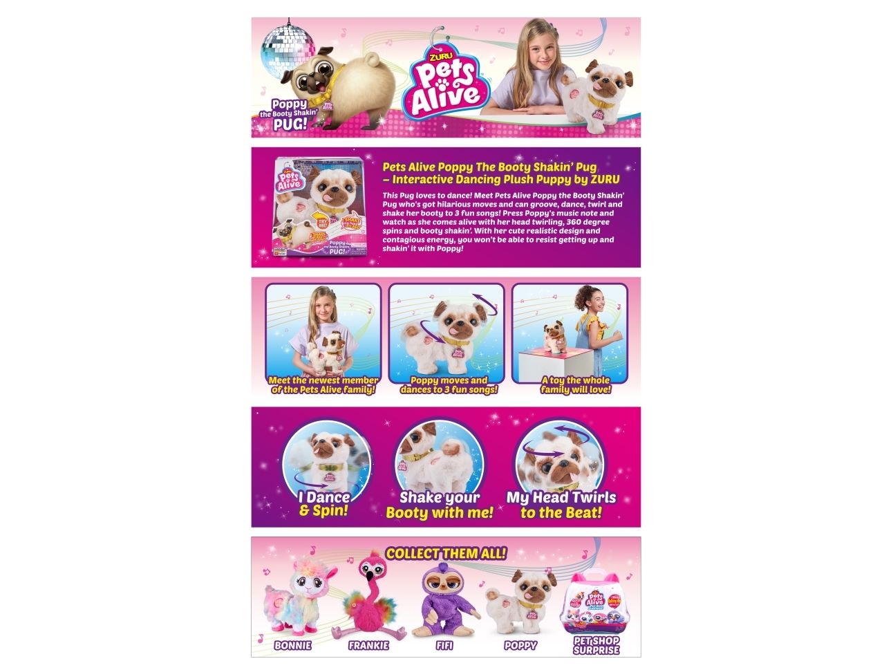 Denne mopsen elsker å danse! Møt Pets Alive Poppy the Booty Shakin 'Pug, som har morsomme bevegelser og kan groove, danse, spinne og riste rumpa til 3 morsomme sanger! Med hennes søte realistiske design og smittende energi, er det umulig for hele familien å ikke reise seg og danse med Poppy!