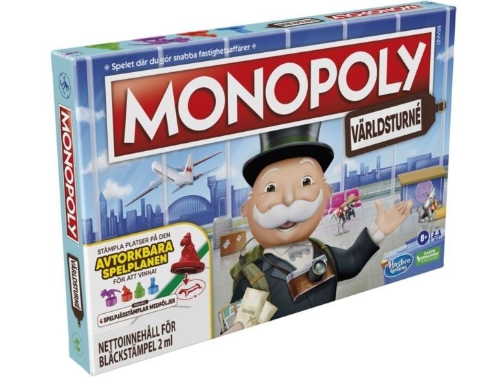 Monopoly Travel World Tour-brettspillet er en vri på det klassiske Monopoly-spillet hvor spillerne oppdager og reiser til spennende steder. Spillerne kjøper steder, fullfører reisemål og stempler spillebrettet med spillebrikkestemplet sitt for å vinne. Stemplene kan tørkes av spillebrettet når spillet er over. Lag minner med Reisedagbok-kortene som blir til en del av fremtidige spill, og lær morsomme fakta om steder over hele verden underveis. Et flott spill for reiseglade personer! Denne reiseutgaven av Monopoly-spillet er et morsomt spill for spillekvelder med familien, og det er et gøy spill for barn fra 8 år. Navnene og logoene Hasbro Gaming, Parker Brothers og Monopoly, det karakteristiske designet av spillebrettet, de fire hjørnefeltene, navnet og figuren Mr. Monopoly samt de karakteristiske elementene på brettet og spillebrikkene er varemerker som tilhører Hasbro for eiendomshandelsspillet og spilleutstyret.