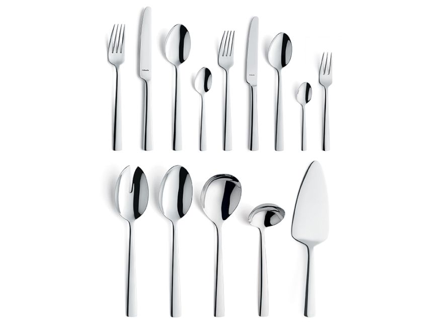 • 6 bordkniver • 6 bordgafler • 6 bordskjeer • 6 dessertkniver • 6 dessertgafler • 6 dessertskjeer • 6 kaffeskjeer • 6 teskjeer • 6 konditorgafler • 2 serveringsskjeer • 1 konditorskje • 1 salatserveringssett bestående av en salatgaffel og en salatskje • 1 sausskje