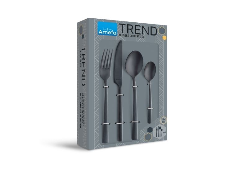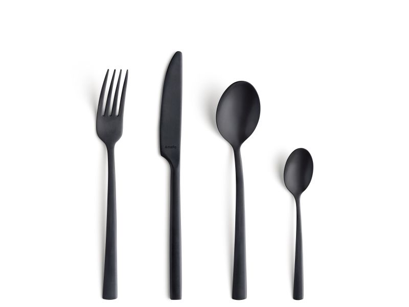 Svart er en av trendfargene for tiden. Fargen er lett å kombinere med kobber, hvit, gull, sølv og tre, også i din borddekking. Med Amefa Vintage sort bestikk kan du lage vakre kombinasjoner og skape din egen atmosfære. Foretrekker du moderne? Kombiner svart med andre metalliske toner som stål, gull og sølv. I tillegg til en luksus gir dette også et hardt og industrielt utseende. Foretrekker du landlige områder? Kombiner svart med tilbehør i tre. Kvalitet er av avgjørende betydning hos Amefa. Dette bestikket er produsert med stor omhu og presisjon og er laget av høykvalitets kromstål. Håndvask foretrekkes og det anbefales å bevare fargen og glansen. *16-delers 4-manns bestikksett * 4 bordkniver, 4 bordgafler, 4 bordskjeer, 4 teskjeer * Vintage look med slankt design * Svart matt steinvask-finish.