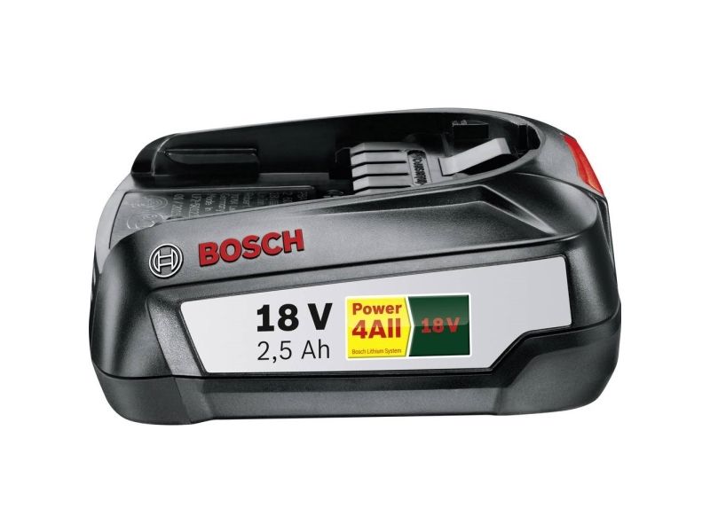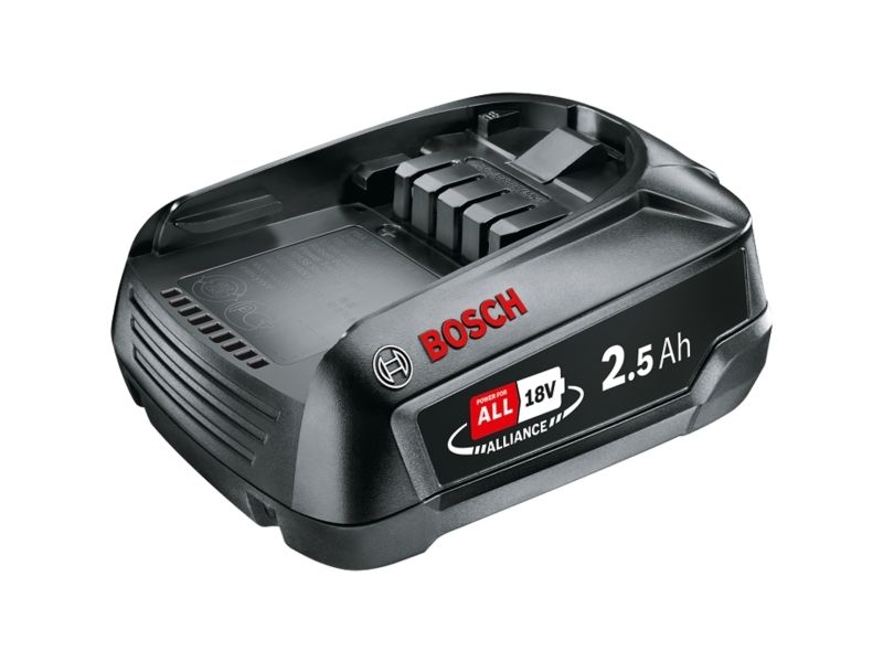 The 18 V battery with 2.5 Ah is the right accessory for all tools in the 18 V Power4All System. One battery fits all tools, saving the DIYer additional purchase costs. Innovative lithium-ion technology and electronic cell protection from Bosch mean that users can rely on a long battery lifetime. These technologies protect the battery against deep discharge and put an end to memory effect and self-discharge.