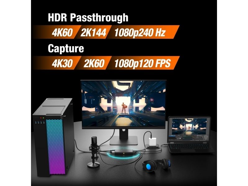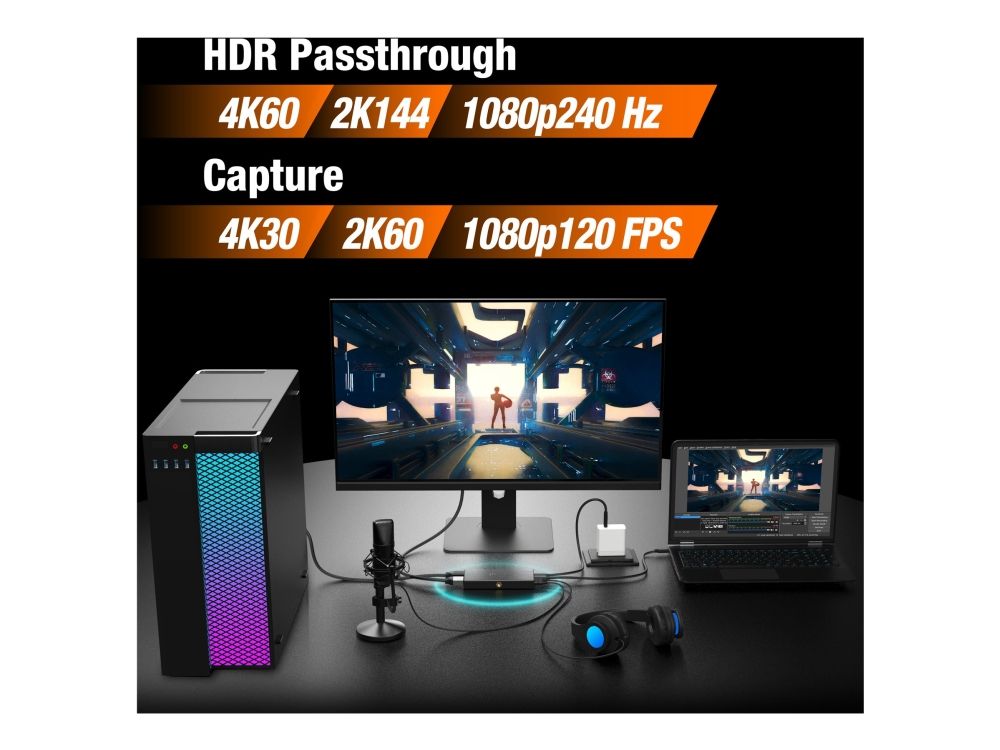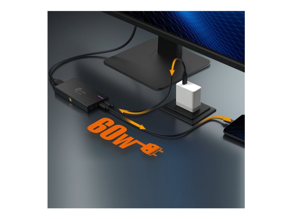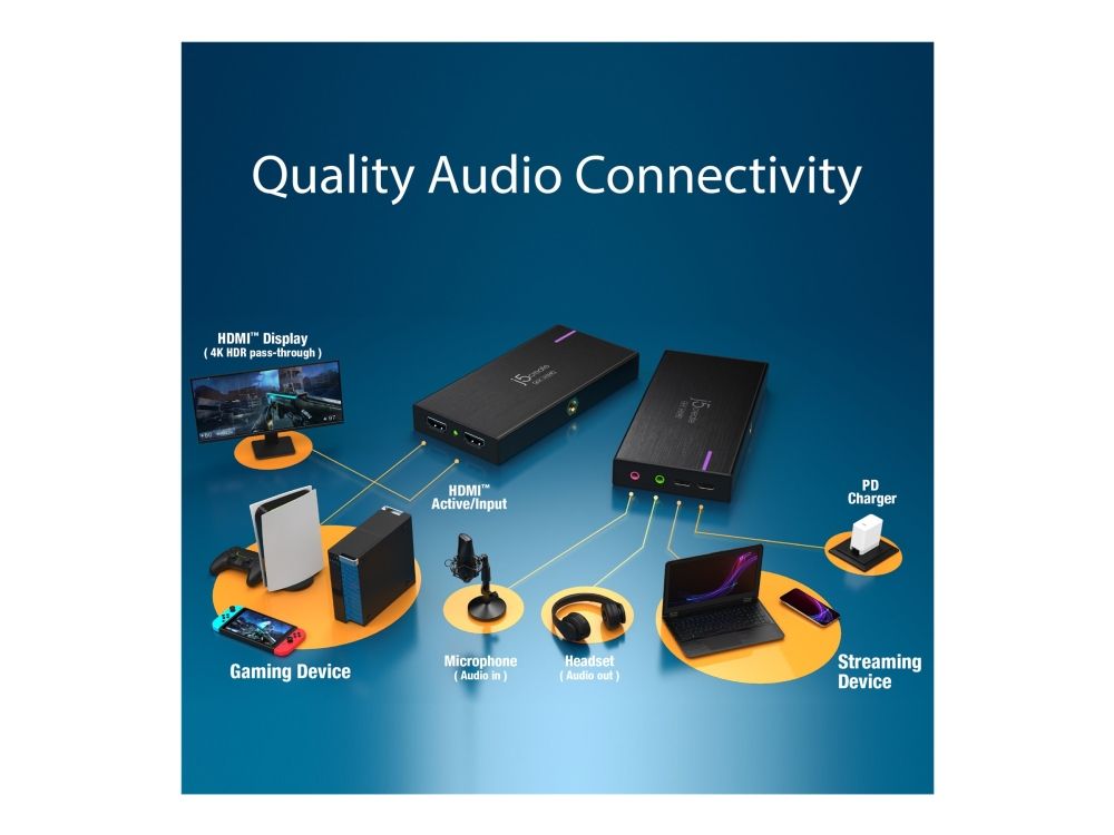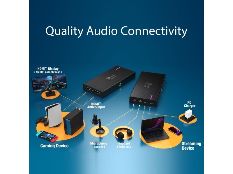 JVA14 4K Game Capture Station er en opptaksenhet designet for å streame og ta opp spillingen din. Den støtter 4K ved 30 b/s videoopptak med 4K ved 60 b/s gjennomgang for konsoller som støtter 4K-oppløsning. Den har en 3,5 mm lydinngang og mikrofoninngang som gjør at et hodesett kan kobles til for å strømme kommentarer direkte på PlayStation 4/5, Xbox Series X/S og Xbox One X/S. Det er fullt kompatibelt med OBS og annen videostrømmingsprogramvare, noe som gjør den perfekt for livestreaming. JVA14 er Plug-and-Play og kompatibel på bærbare og stasjonære datamaskiner med macOS og Windows.