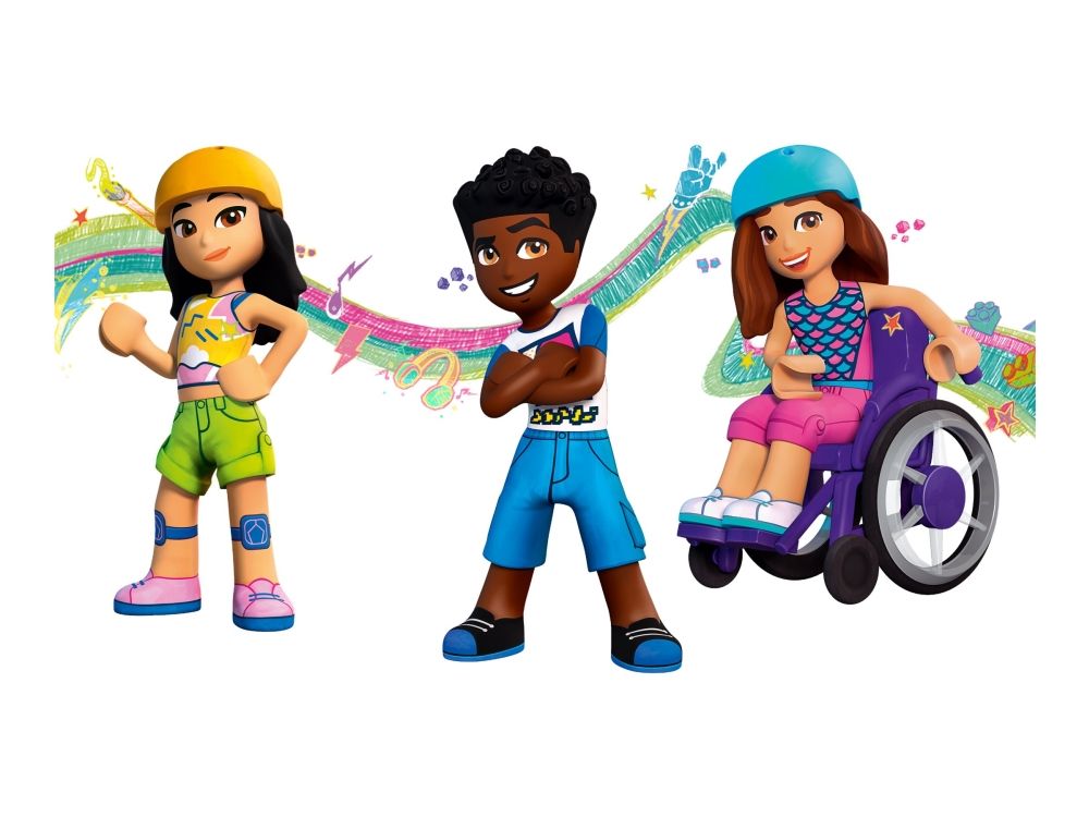 2. Tre minidukker og tilbehør – settet inkluderer LEGO® Friends figurene Liann, Zac og Luna, ramper, rails, inline-skøyter, rullebrett, sparkesykkel, Lunas rullestol og hjelm til alle figurene