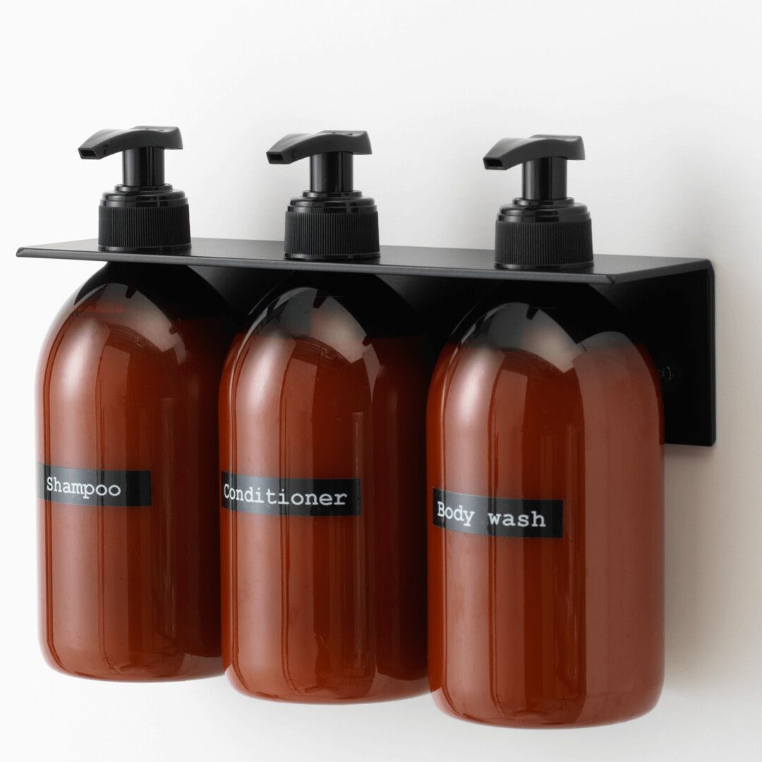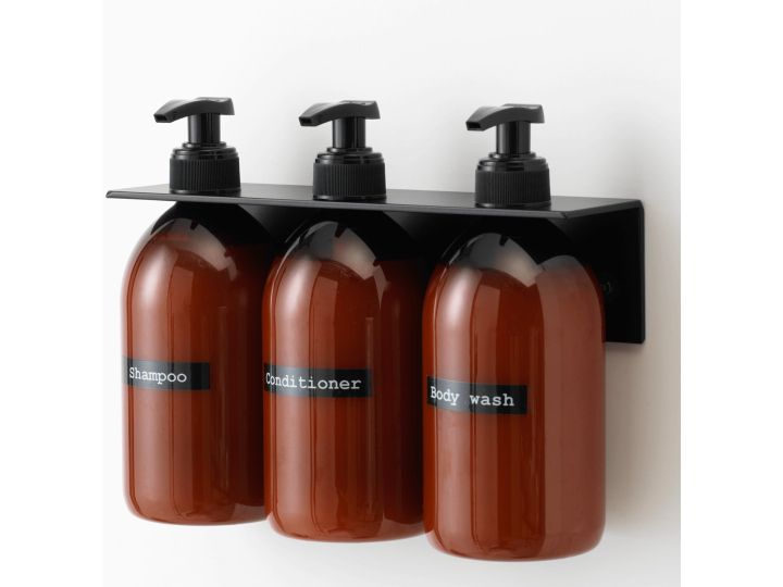 Sort sæbeholder til væg 3 flaskerMed en sæbeholder til væggen kan du frigøre plads omkring håndvasken eller i badet og sørge for, at din sæbe, shampoo eller balsam altid er lige ved hånden.