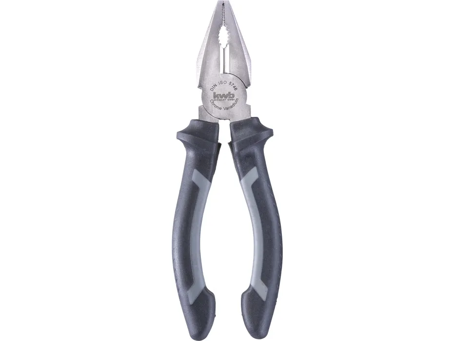 Kombitænger-form i henhold til din ISO 5746, CV-stål, satin-finish mat, 2-komponentgreb for optimal kraftoverførsel og uanstrengt arbejde, med gribezoner til flade og runde materialer ved alsidig anvendelse, med flade skær og skrå hovedkanter, til hård og blød tråd, skær hærdet. Med praktisk tangholder til værkstedet, hertil skrues plastclip ganske enkelt fast til værktøjsvæggen.