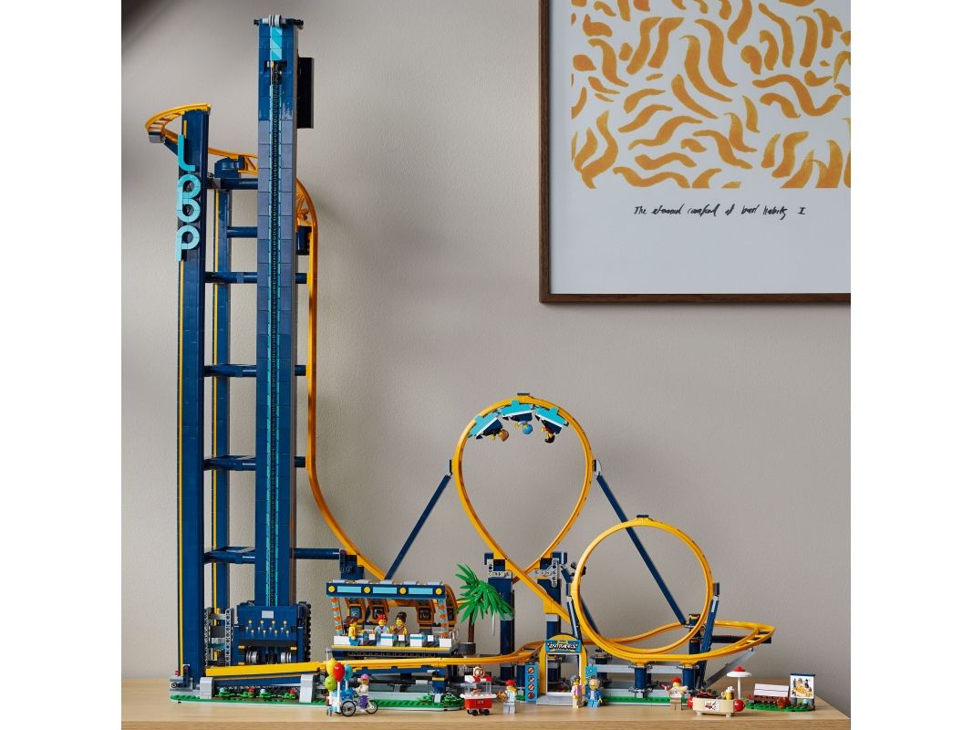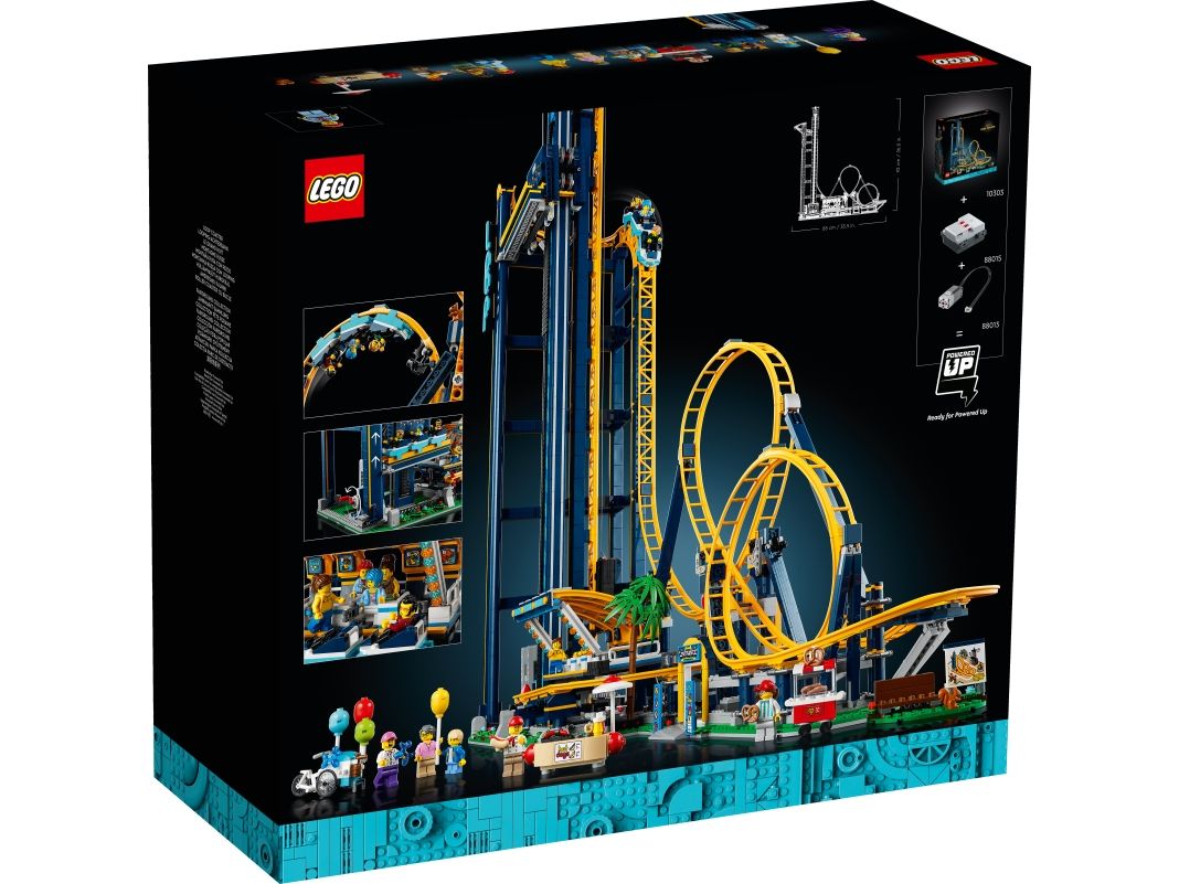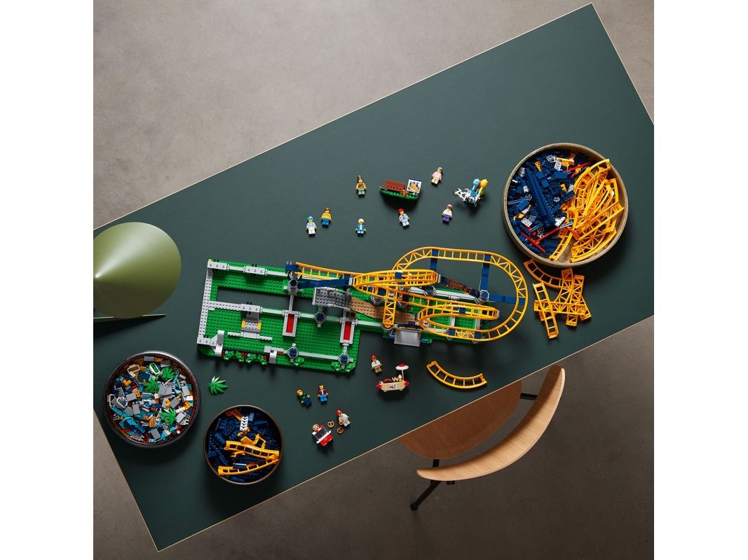 Høye fjell og dype daler Berg-og-dal-banen følger tyngdekraftens lover og inkluderer ett tog, en ombordstigningsplattform med grinder som kan åpnes, og et styrepanel. Senk bøylene for å sikre passasjerene i vognene, og frigjør deretter bremsen for å kjøre toget til foten av heisen. Aktiver heisen, og gled deg til å suse i full fart gjennom berg-og-dal-banens looper og svinger. Oppgrader modellen med LEGO Powered Up (kjøpes separat) for å motorisere heisen. Inkluderer tilbehør som parkbenk med kart, ballongselger med sykkel, saltkringle-kiosk, pølsebod og høydemåler.