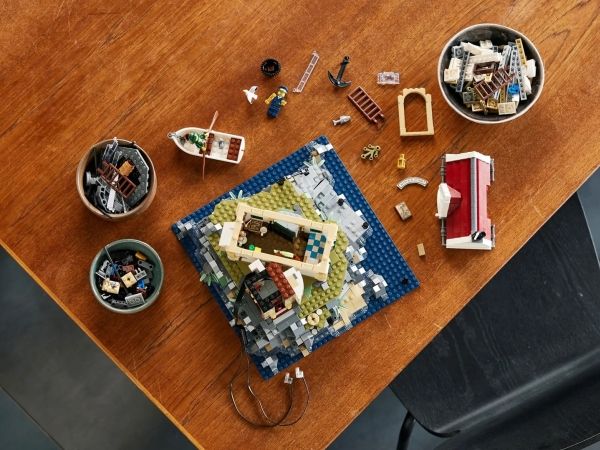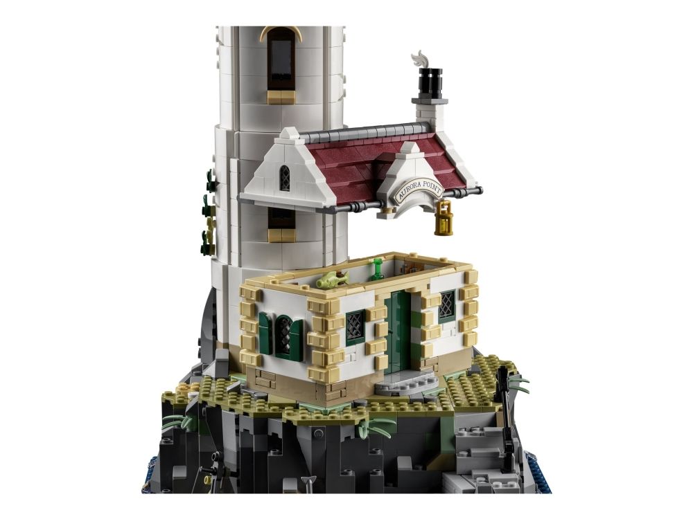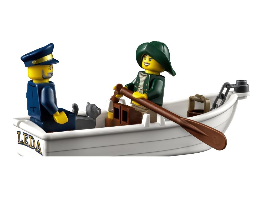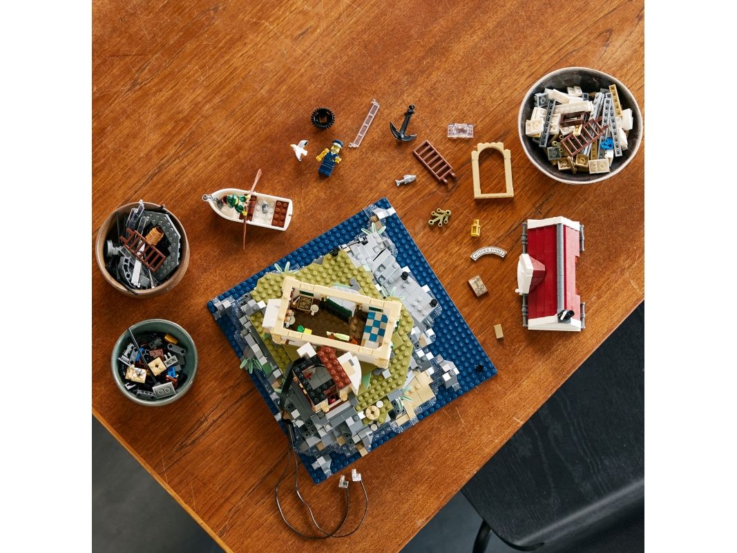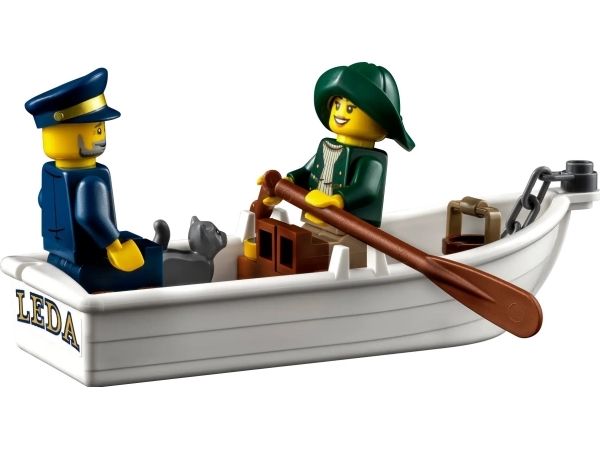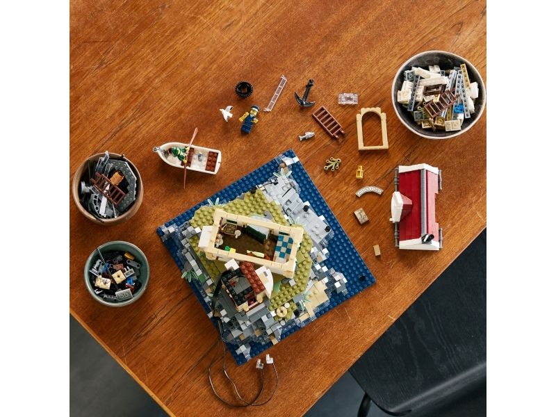 To LEGO® minifigurer og to figurer – inkluderer en fyrvokter og en sjømann med byggbar robåt samt en katt og en måke som er prikken over i-en på denne flotte modellen