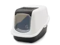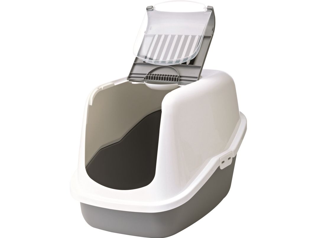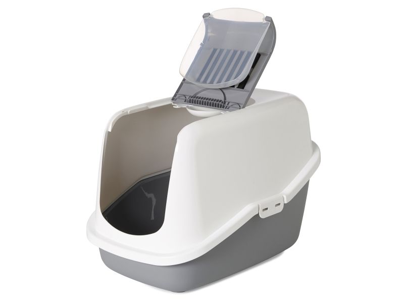 Kattlåda med tak. Inbyggt handtag, öppningsbar front, plastlucka och filter med aktivt kol som minskar att dålig lukt och damm sprider sig från kattlådan. En upphöjd konstruktion som förhindrar läckage om hankatter kissar mot bakväggen.