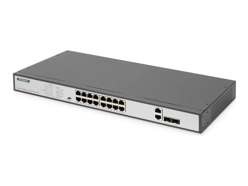 The DIGITUS® Fast Ethernet PoE switches are designed for medium to large network systems. The PoE function and the 19" size enable an uncomplicated integration into your network. The switches are a great choice to improve the performance and efficiency of your network.Digitus 16 Port Fast Ethernet PoE Switch, 19 Inch, Unmanaged, 2 Uplinks. Switch type: Unmanaged. Basic switching RJ-45 Ethernet ports type: Fast Ethernet (10/100), Basic switching RJ-45 Ethernet ports quantity: 16. Full duplex. MAC address table: 8000 entries, Switching capacity: 7.2 Gbit/s. Networking standards: IEEE 802.3, IEEE 802.3ab, IEEE 802.3af, IEEE 802.3at, IEEE 802.3u, IEEE 802.3x, IEEE 802.3z. Rack mounting, Form factor: 1U