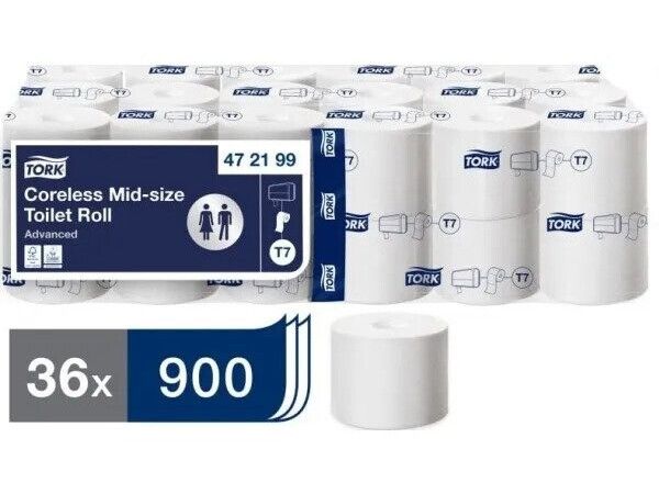 Toalettpapir Tork T7 Advanced, 2-lags, 103,5 m x 9,3 cm, Ø13 cm, hvitt, resirkulert papir, uten kjerne - (36 ruller)