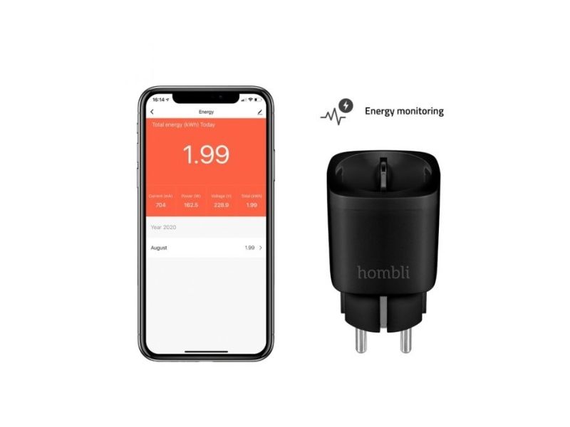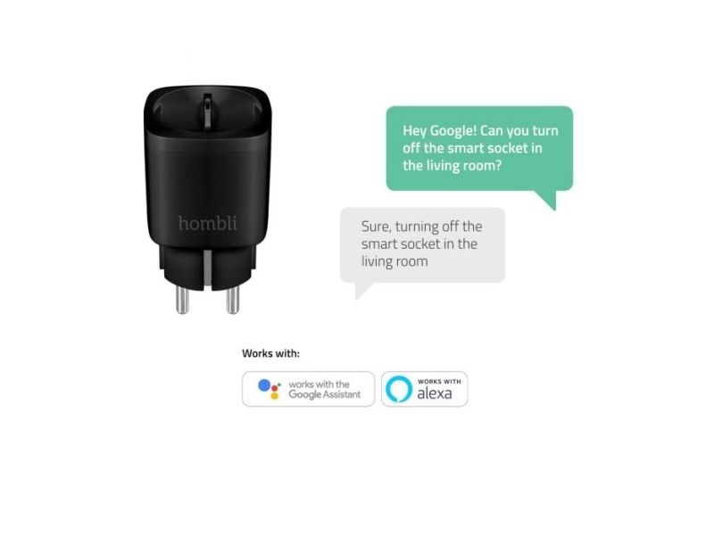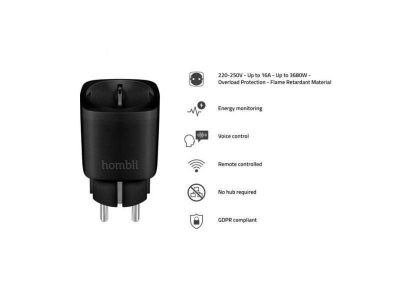 PRODUCT DESCRIPTION No matter where you are, control home electronics using your tablet or smartphone with the Hombli Smart WiFi Plug. You can turn devices on/off, check status, create schedules, and set timers using the Hombli app. With remote access, you are able to check the real-time status of your home appliance anytime and anywhere. Wherever you are, control your devices before arriving home or after leaving. Use the away-mode to make it look like you are at home, even when you are halfway around the world, you can take control and switch off/on or schedule in regular times to conserve energy and reduce your energy bill. The smart wall socket monitors the energy usage of each connected device and shows you how much electricity an electronic device used. Use Amazon Alexa or Google Assistant to voice control to an electronic device that is connected to your smart socket At Hombli we protect your privacy. All GDPR principles are met, user data is only accessible for the user itself and is never shared with third parties. Custom designed Hombli App with a very user-friendly interface. Available in English, Spanish, French, German, Italian, Danish, and DutchHombli HBPP-0205. Placement supported: Indoor, Product colour: Black, Best uses: Home. Applications supported: Hombli app, Mobile operating systems supported: Android, iOS. Connectivity technology: Wireless, Wireless technology: Wi-Fi. Maximum input power: 3680 W, AC input voltage: 220 - 250 V, Maximum current: 16 A. Width: 46 mm, Height: 83 mm