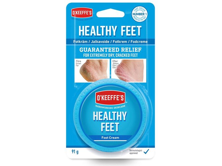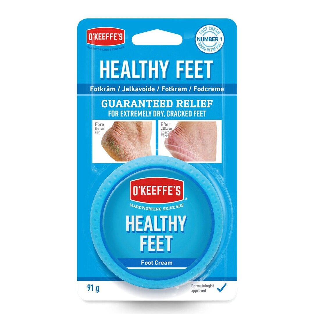 O'Keeffe's Healthy Feet er fotkremen for tørre føtter som lett sprekker. Denne fotkremen er uten parfyme og duft. Fotkremen mykgjør tørr hud effektivt, stimulerer hudens naturlige reparasjonsprosess ved å tilføre fuktighet, regulerer pH-balansen og hjelper huden med å holde på fuktigheten. Helsesprekker og ekstremt tørre områder lindres effektivt med sunne føtter. Helt fettfri og ikke fetende. Healthy Feet er også klassifisert som hypoallergen, noe som betyr at produktets formulering er spesielt utviklet for å redusere risikoen for allergiske reaksjoner.