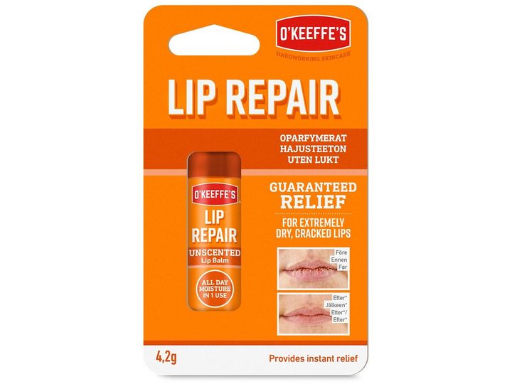 O'Keeffe's Lip Repair Lip Balm beroliger og fukter tørre og sprukne lepper hele dagen. Ved daglig bruk er det klinisk bevist at O'Keeffe's Lip Repair Lip Balm gir øyeblikkelig lindring og fuktighet hele dagen etter bruk, skaper en fleksibel barriere og fukter tørre og sprukne lepper, beskytter mot tørrhet hele dagen, selv når du spiser og drikker, og absorberes raskt for myke og smidige lepper. Okeeffe's Lip Repair Lip Balm er parfymefri og hypoallergen - svært allergivennlig.
