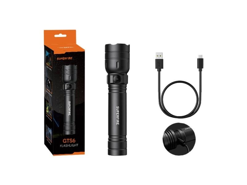 SUPERFIRE GTS6 LED-lommelykt er en oppladbar minilommelykt som kan avgi opptil 360 lumen fra det innebygde litiumbatteriet på 1200 mAh. Denne lille LED-lommelykten er enkel å holde i hånden. Den er perfekt til å ha med seg belysning hver dag.