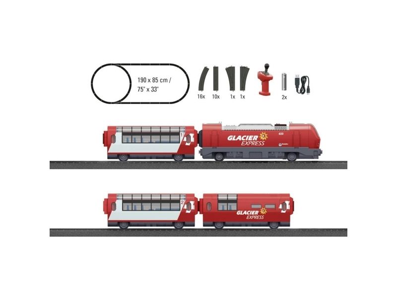 I panoramaet med bjergene!Dine passagerer nyder den smukke kulisse i de schweiziske Alper gennem de kæmpestore vinduer i de to panoramavogne. Den friske bjergluft gør naturligvis sulten. I spisevogn kan du forkæle dine passagerer med typiske landespespecialiteter. Og mens de rejsende med deres syn på Bergen og dale er ved at slappe af, overvinder glacier Express tilsyneladende uden besvær de enorme stigninger og fald takket være det stærke elektriske lokomotiv Vectron.Forbillede: En glacier Express efterfølende persontog. Tog i 4 dele bestående af et el-lokomotiv, 2 panoramasevogne og en spisevogn.Model: Lokomotiv med batteridrev og magnetkobling på den bageste del af køretøjet. Motor, batteri og al elektronik er utilgængelig for børn. Lokomotivet kan oplades med det medfølgende USB-ladekabel. 3 hastigheder til forlæns og baglæns kørsel samt 3 lydfunktioner og 3-lys-spidssignal kan styres via Märklin Power Control-stikket, der er egnet til et barn. Panorama-vogn med transparente tage. Tage til alle 3 vogne kan tages af. Vogne med indvendige indretninger. Toglængde 50 cm.Indhold: 16 buede plastspor, 10 lige plastspor, 1 sporskifte venstre, 1 sporskifte højre og et trådløst praktisk Märklin Power Control stik. Et USB-ladekabel til lokomotivet og 2 x AAA-batterier medfølger. Stickerark til dekoration af toget medfølger. Kan udvides med plastspor fra Märklin my world sortiment. Til spilleglæde lige fra starten medfølger robuste og trædefast plastspor. Flere skinner, mere sjov! Hvis du vil køre endnu flere forskellige strækninger, kan du udvide startpakken med plastikspor fra Märklin my world sortimentet efter ønske.