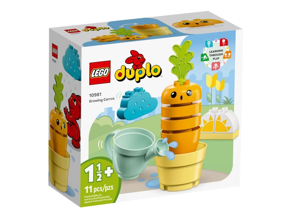 Med det pedagogiske settet LEGO® DUPLO® Min første gulrot som vokser (10981) lærer barn om sunne matvaner og dyrking av planter på en gøyal måte. Dette fargerike settet er laget for å vise smårollinger fra 18 måneder hvordan de kan dyrke en gulrot og få den til å vokse ved å stable klosser oppå hverandre. La førskolebarn bestemme været selv med sol- og regnsky-klosser og gi planten det den trenger for å vokse. Og trenger planten litt ekstra, kan barn vanne den med vannkannen. Se så overrasket gulroten ble! Det vannet må jammen ha vært kaldt!