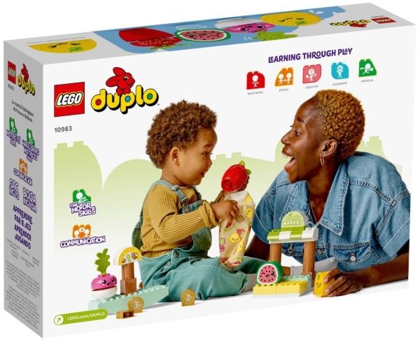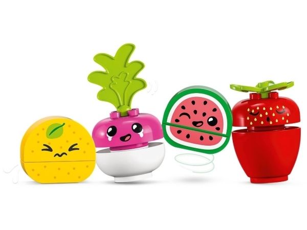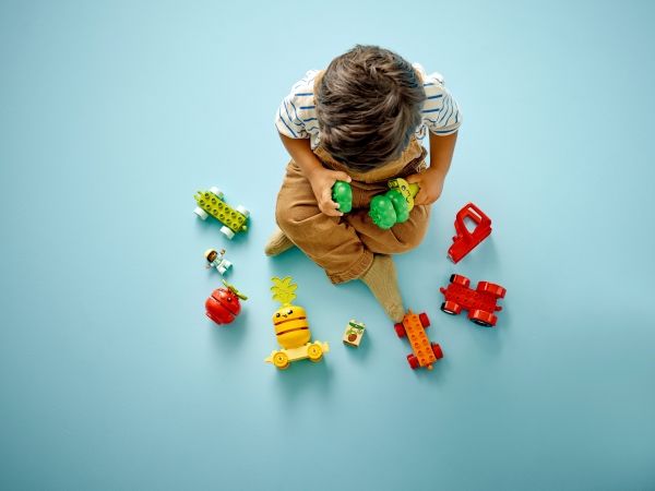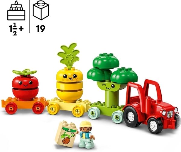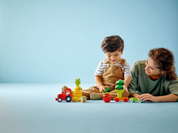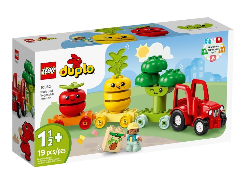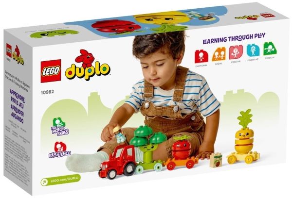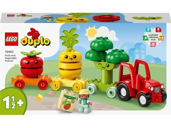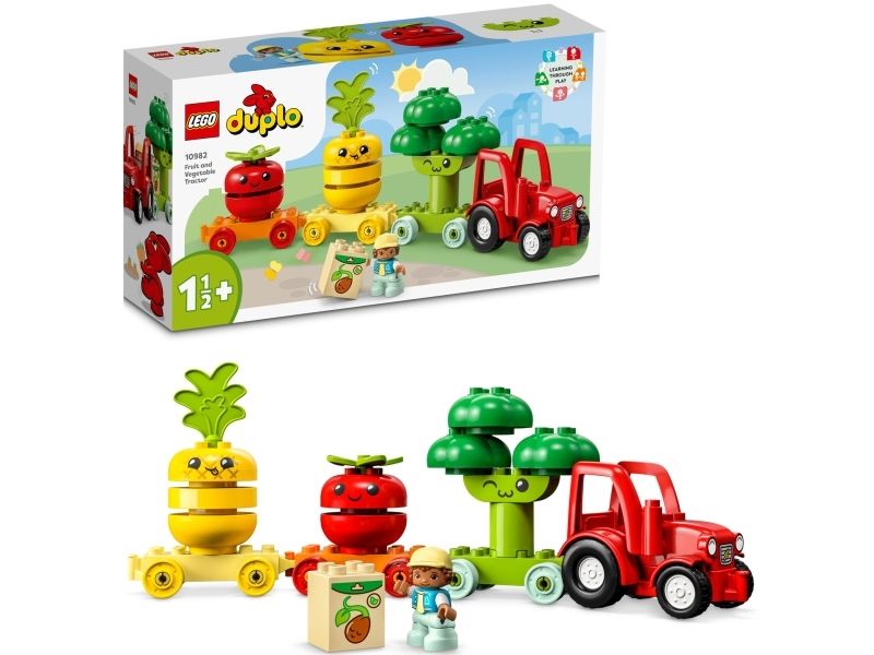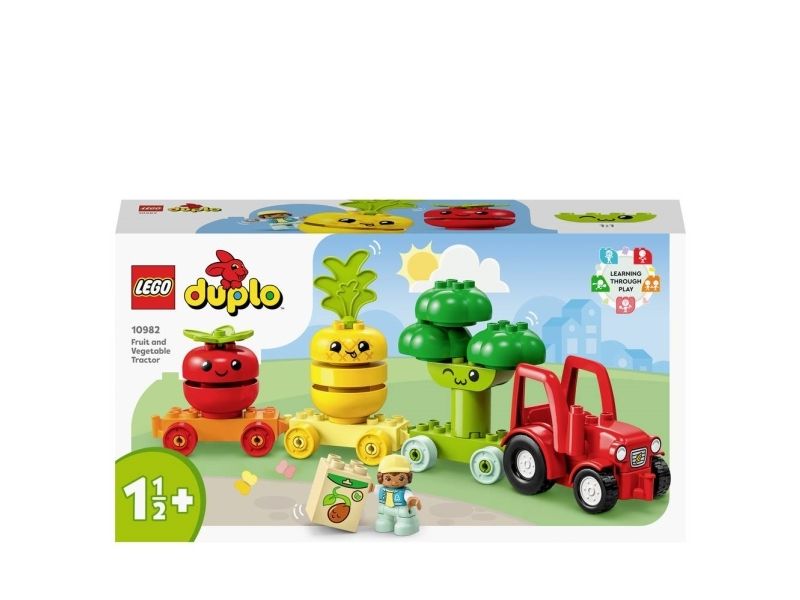 LEGO® DUPLO® Min første frukt- og grønnsakstraktor (10982) gir smårollinger masse morsom læring. Førskolebarn kan bli med når bonden høster frukt og grønnsaker med den kjørbare traktoren med tre hengere. Barn fra 18 måneder kan finpusse finmotorikken sin og samtidig lære om hvordan de kan dyrke frukt og grønnsaker og få dem til å «vokse» ved å stable klosser. Settet byr også på gøyal fargesortering – førskolebarn kan finne riktig henger til hver frukt eller grønnsak, eller de kan bruke fantasienog sette sammen forskjellige farger og bytte om på ansiktene!