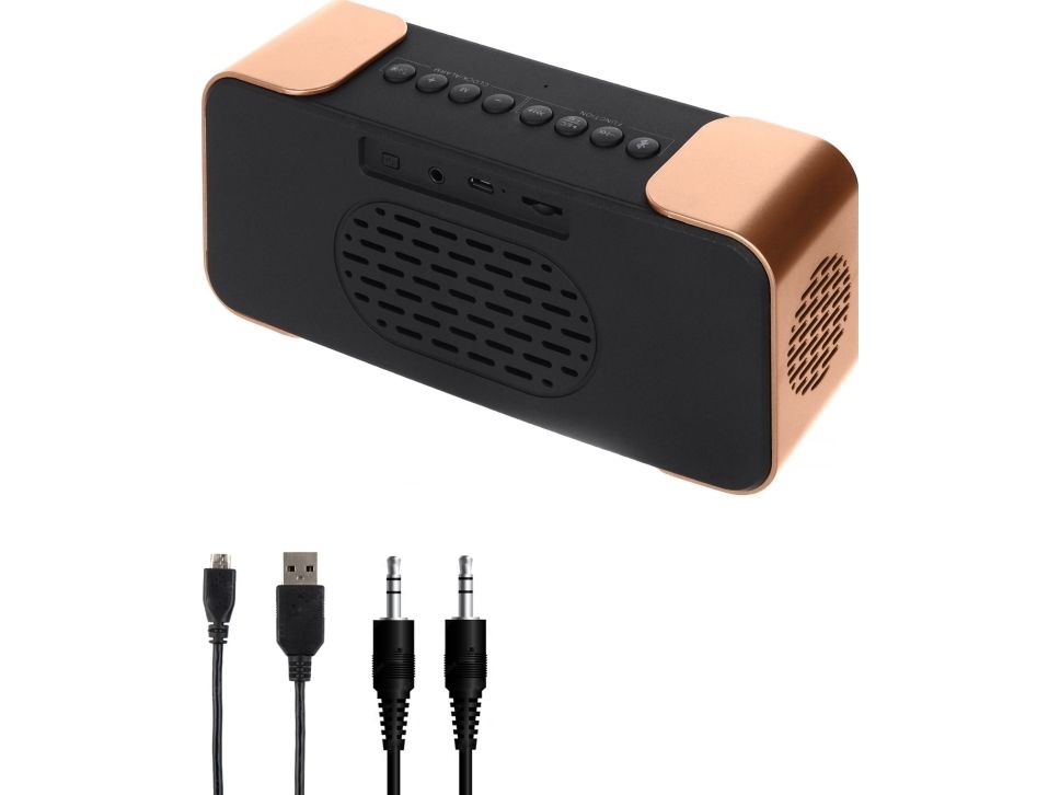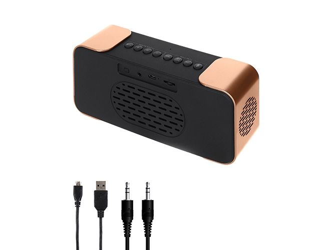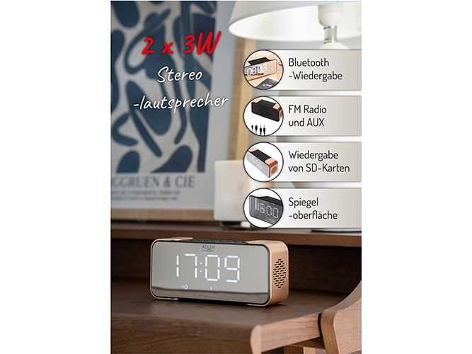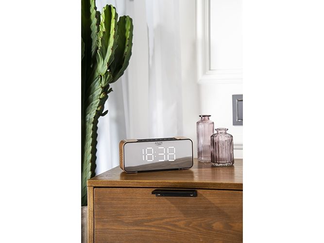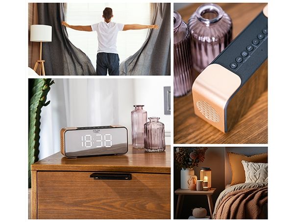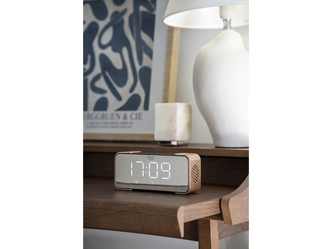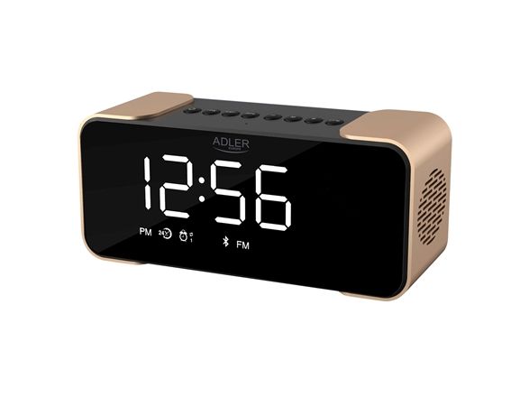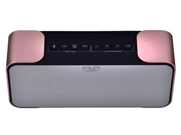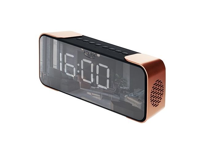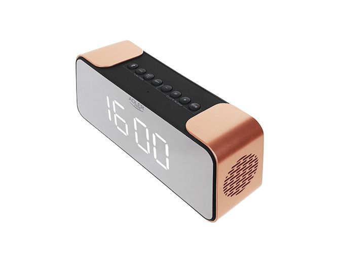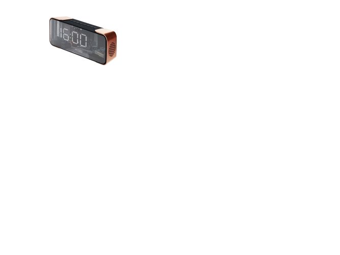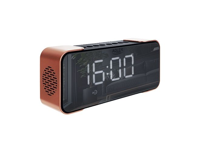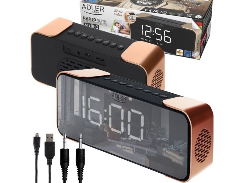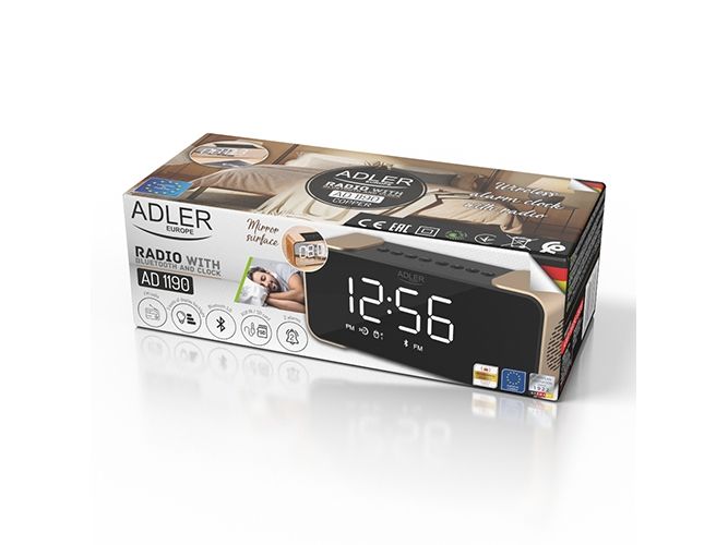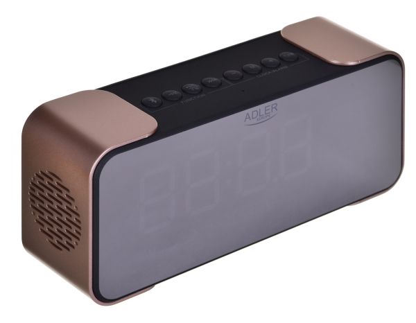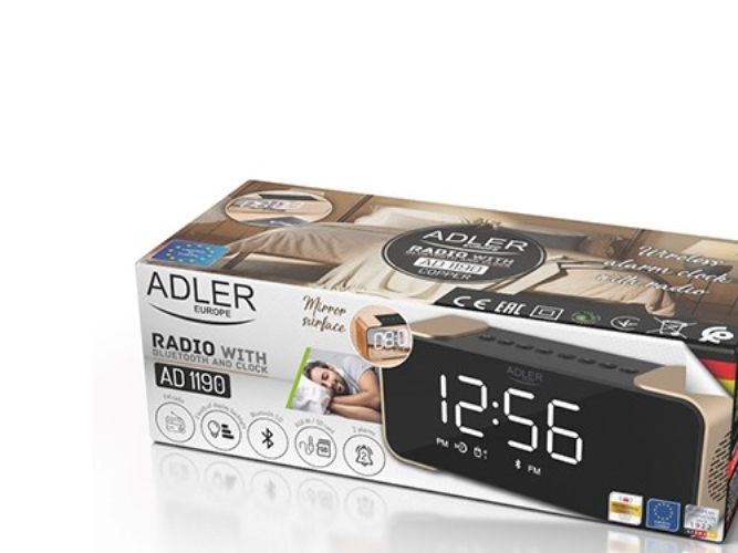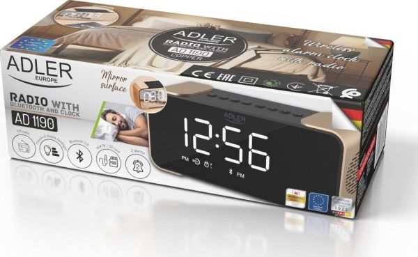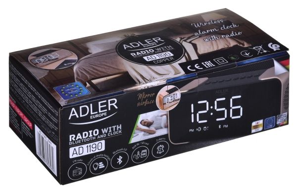 The radio alarm clock AD 1190 is a device with many useful functions that you can choose depending on your needs. First of all, it has 3 alarm clock modes. A big advantage is the readable LED display with 3 levels of backlight intensity, from which you can easily read the time . The alarm clock is powered by a Lithium Ion battery with a capacity of 1800 mAh. The device has a built-in FM receiver, Bluetooth 5.0, AUX and SD input.Adler AD 1190CR. Type: Digital alarm clock, Product colour: Black, Copper, Time format: 12/24h. Display type: LCD, Backlight colour: White. Audio system: stereo. Power source: Battery. Width: 190 mm, Height: 54 mm, Depth: 84 mm