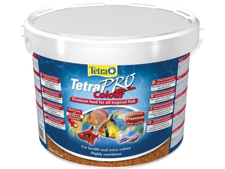 TetraPro Colour crisps. Hovedfoder til alle prydfisk for et langt og sundt fiskeliv.Består af over 40 værdifulde næringstoffer.Normal og XL-flager muliggør en ideelt tilpasset ernæring til den pågældende fiskestørrelse. 10 L
