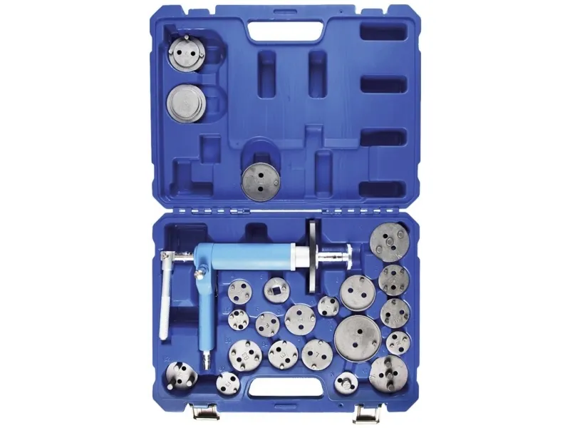 Pneumatisk bremseskiveindstillingsværktøjssæt PASSER TIL: ALFA ROMEO, AUDI, BMW, CITROEN, FIAT, FORD, G.M., HONDA, IVECO-DAILY, LANCIA MAZDA, MERCEDES-BENZ, MINI, MITSUBISHI, NISSAN, OPEL, PEUGEOT, RENAULT LAGUNA III / SCENIC III / MASTER III, ROVER, SAAB, SUBARU, SUZUKI, TOYOTA, VW, VW PASSAT (FRA 2005) Med trykluftspindel til højre- og venstredrejende bremsstempler.