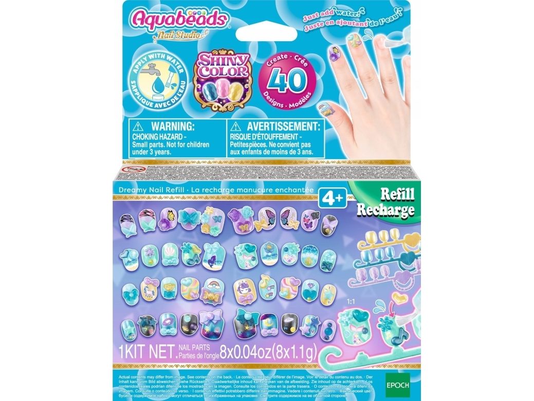 Aquabeads Nail Studio Fancy Nail Refill-sættet inkluderer Aquabeads negle og dekorationer til over 40 negledesigns og klistermærker. Den skinnende farve Aquabeads negle og dekorationer tilføjer en glitrende og glitrende følelse til dine Aquabeads negle kreationer!