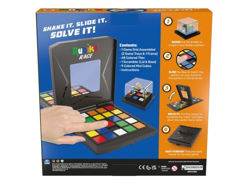 Så kul som Rubiks kube er, er den et spill for én spiller. Hvis du vil ha det det samme spennende puslespillet, men for 2 spillere, sjekk ut Rubik’s Race Game. Den kombinerer strategien til Rubik’s Kube med konkurransedyktig spill. Hvor raskt kan du matche mønsteret på rammen med dine egne fargede brikker? Forhåpentligvis raskere enn den andre du spiller med. Bare rist for å lage et nytt mønster, og skyv deretter brikkene så raskt du kan for å matche det mønsteret. Den første som matcher den vinner.