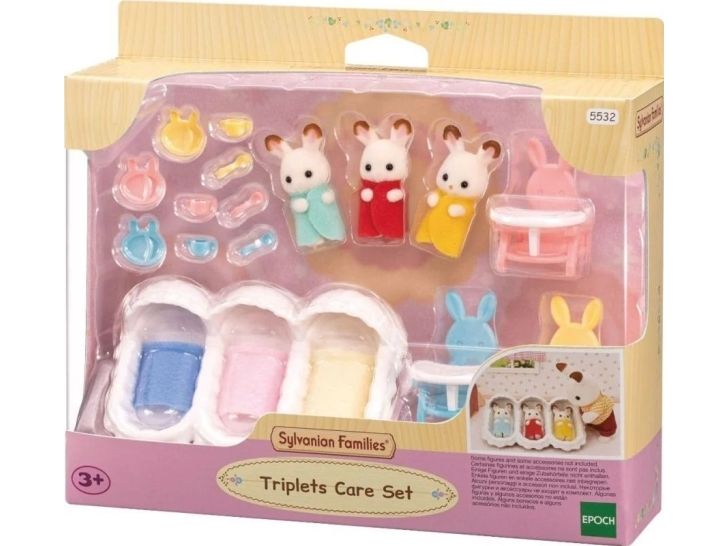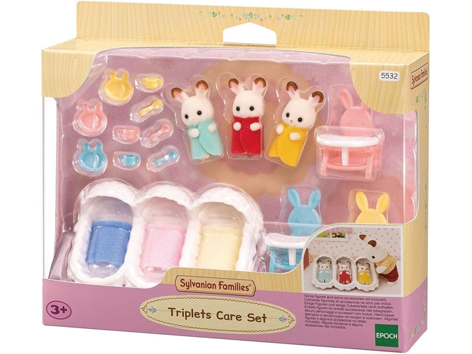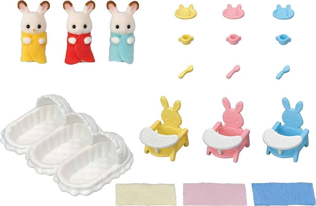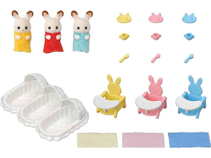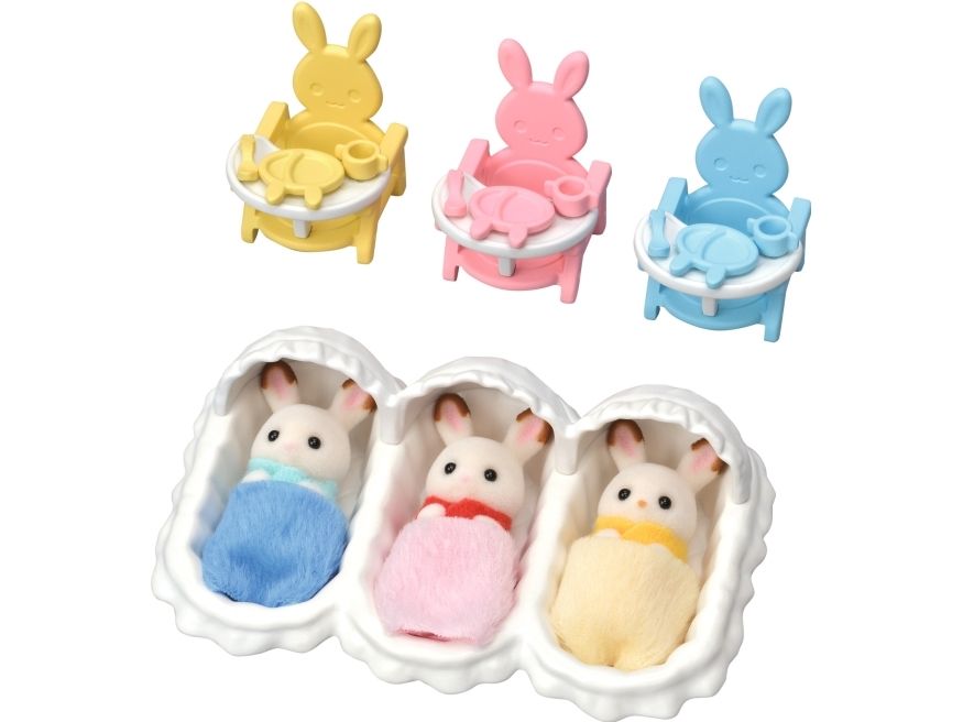 De søte sjokoladekanin-trillingene elsker å bli stelt med. Med lekesettet startersett for trillinger i Sylvanian Families kan man mate de søte trillingene og legge dem i sengen. De små spiser litt i de gule, blå og rosa kaninformede stolene før de legger seg. Trillingsengen inkluderer et sengeteppe til hver som trillingene blir tildekket med. Settet med trillingsengen inkluderer tre sengetepper, babystoler med sikkerhetsbelte og sjokoladekanintrillingene. En trillingfigur er ca 4 cm høy. Egnet for barn f.o.m. 3 år.