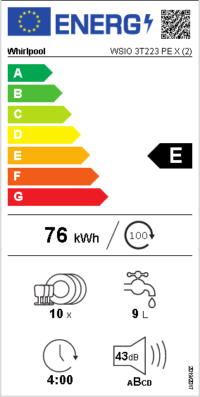 Whirlpool WSIO 3T223 PE X, Fullstendig innebygget, Slimline (45 cm), Rustfritt stål, 1,3 m, 1,55 m, 1,5 m