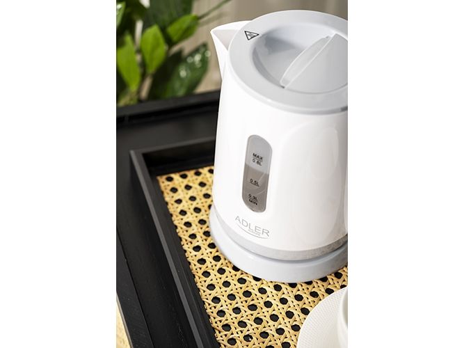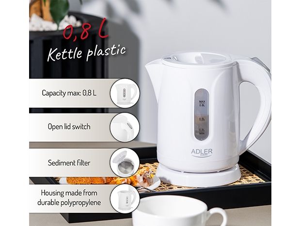 Nom. Power: 850W. Max capacity: 0,8 L. Sediment filter. Control light. Swivel base 360°. Flat s/s heating element. Auto shut off with boil dry protection.