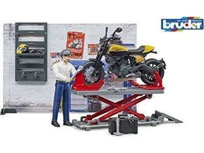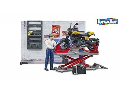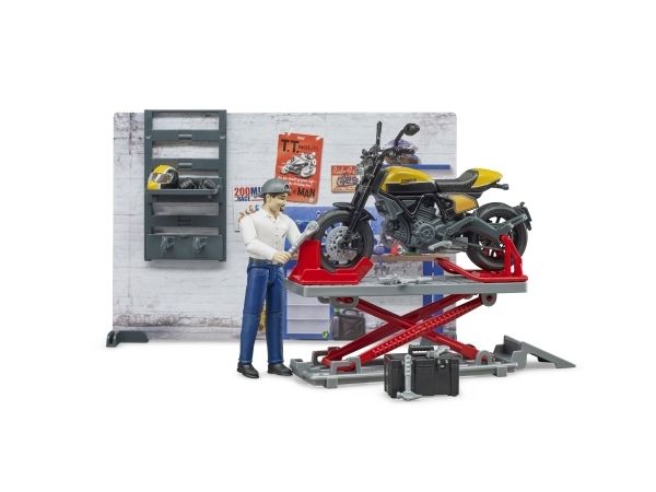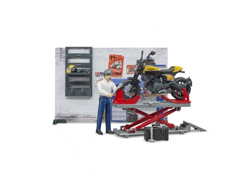 bworld er BRUDER's legetøjsverden. Den består af bevægelige figurer, dyr, tilbehør og senest også temasæt og er tildelt de velkendte BRUDER-kategorier. Hvad enten det er som chauffør, rytter, vandsportsentusiast eller på hospitalsafdelingen eller motorcykelværkstedet, giver bworld-varer timevis af sjov alene eller er den perfekte tilføjelse til de detaljerede køretøjer. Med de nye temasæt kan du dykke endnu dybere ned i Bruders verden. Trykte vægelementer med justerbare fødder, der er nemme at montere, danner nu plads til endnu mere virkelighed, når man leger og det nye reolsystem kan også interagere med elementerne. Den detaljerede Scrambler Ducati Scrambler Full Throttle er fastgjort på løfteplatformen med beslag til service. Mekanikeren har en værktøjskasse med omfattende udstyr til sin rådighed. Han kan opbevare sin hjelm og handsker på væghylderne, indtil de skal bruges til prøvekørslen. bworld motorcykelværkstedet kan nemt kombineres med de andre bworld temasæt. Fra det store udvalg af fantastiske Bruder-køretøjer er RAM Power Wagon med Scrambler Ducati Desert Sled (varenr. 02502) og Land Rover Station Wagon med trailer og Scrambler Ducati Full Throttle (varenr. 02589) gode matcher til den nye bworld motorcykelværksted