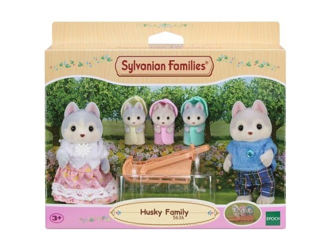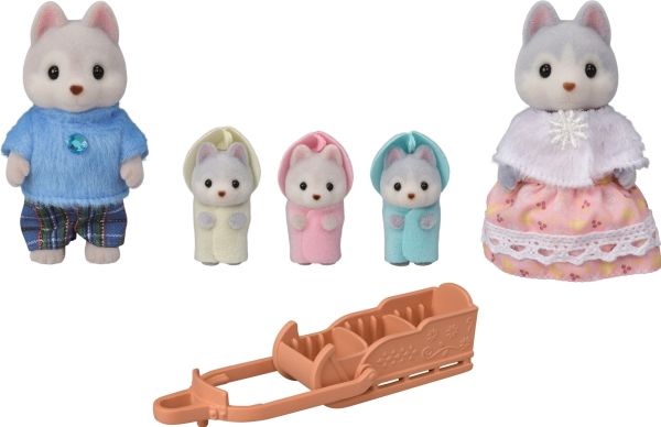 Sylvanian Families huskyfamilie består av far Vincent, mor Avril og de tre barna Rae, Drake og Nelly. Far Vincent er en veldig suksessfull designer. Han har alltid nye ideer som alle elsker. Han designet til og med kjelker og sykler til barna. Han er også god venn med oppfinneren Cedric, valnøtt-ekornfaren. Moren Avril er ingeniør som bygger kjøretøyene designet av Vincent. Hun har et fantastisk verksted der hun produserer hver del med stor omhu. Avril liker ikke kulde. Derfor har hun alltid på seg en tykk, varm kappe om vinteren. Husky-trillingbabyene er bestevenner siden de ble født. Rae og Nelly elsker å bli med å ake fort og risikabelt. Siden broren Drake er litt engstelig, sitter han mellom søsknene sine for å føle seg tryggere. Trillingene har på seg koselige hettegensere som er skikkelig gode og varme. Rae, husky-trillingbabyen er alltid glad og gråter sjeldent. Drake blir fort redd. Han er veldig nervøs når han sitter foran på kjelken. Nelly er alltid på farten. Alt hun ser er spennende for henne. Hvis det er en lyd mens hun sover, våkner hun med én gang for å se hva som skjer. Figursettet inneholder mor, far og trillingene på en kjelke. De fløyelsmyke figurenes hode, armer og bein er bevegelige. Klærne deres kan tas av og på. Figurene i Sylvanian Families huskyfamilie er mellom 3 og 8 cm store, og egnet for barn f.o.m. tre år.
