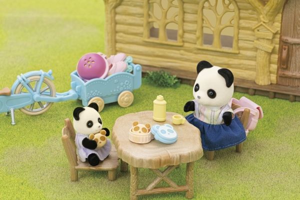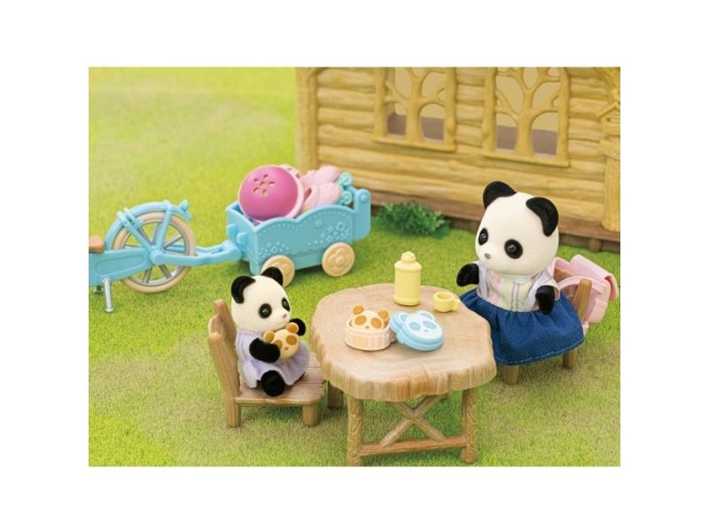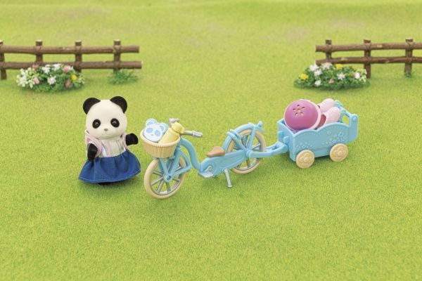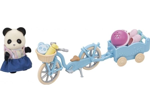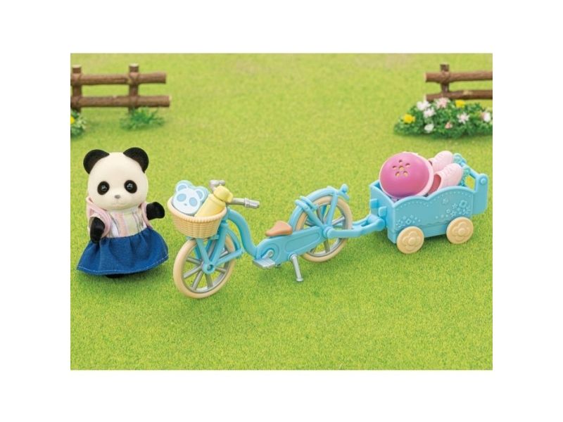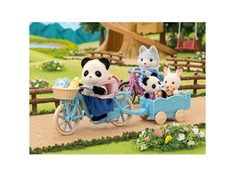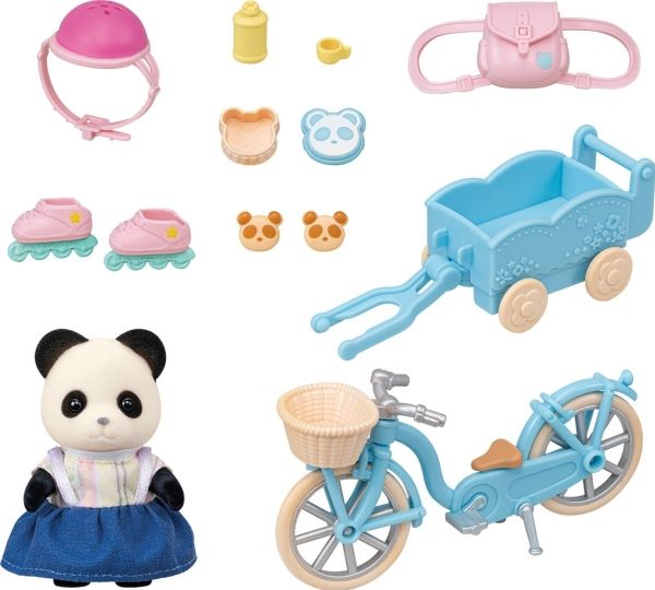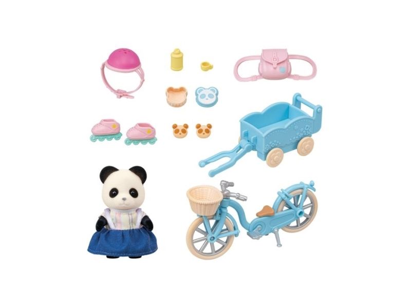 Pandajenta Rosalina elsker å kjøre med sykkelen eller rulleskøytene sine. Det er montert en kurv på styret til sykkelen, og bak på sykkelen kan det henges på en liten tilhenger. I tilhengeren kan en baby eller tvillingene bli med, eller det kan transporteres bagasje. Pandajenta har lagt maten til en liten piknik i kurven på styret. Sylvanian Families sykkel- og rulleskøyte-lekesett med figur inneholder en sykkel med kurv, en sykkeltilhenger, en hjelm, rulleskøyter, en ryggsekk, en brødboks, kjeks, en flaske og en pandajentefigur. Den fløyelsmyke figuren er ca 6 cm stor. Hode, armer og bein er bevegelige. Klærne deres kan tas av og på. Egnet for barn f.o.m. tre år.
