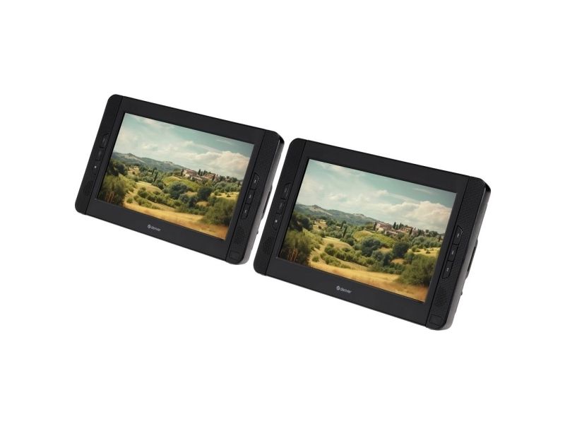 Bærbar Twin DVD-afspiller Bærbar DVD-afspiller med 25,4 cm (10) LCD-skærm og ekstra 25,4 cm (10) skærm, så du kan se den samme film på begge sider AV-udgang til forbindelse med eksternt TV Hovedtelefonervenstre, AV-indgang, USB og SD-kortlæser Fjernbetjening Indbygget litium-batteri (ca. 2 timers afspilning pr. opladning) Praktisk bæretaske, der også fungerer som holder i bilen.