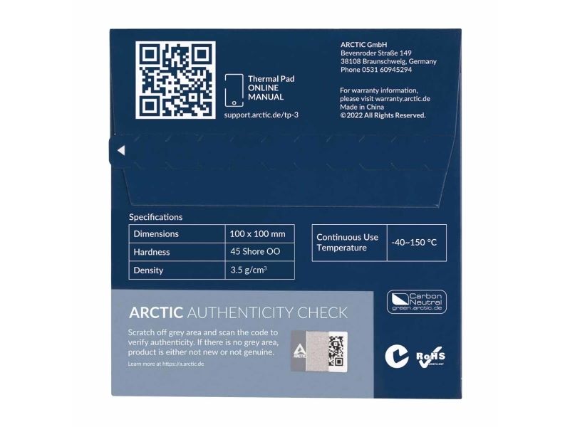 The ARCTIC TP-3 thermal pad is designed to provide thermal conductivity for various applications. With an operating temperature range from -40°C to 150°C, this thermal pad ensures reliable performance even in extreme conditions. Compliant with UL 94 V-0 standards, it offers safety and efficiency for electronic components, helping to maintain operating temperatures for improved device performance and longevity.