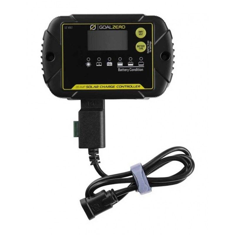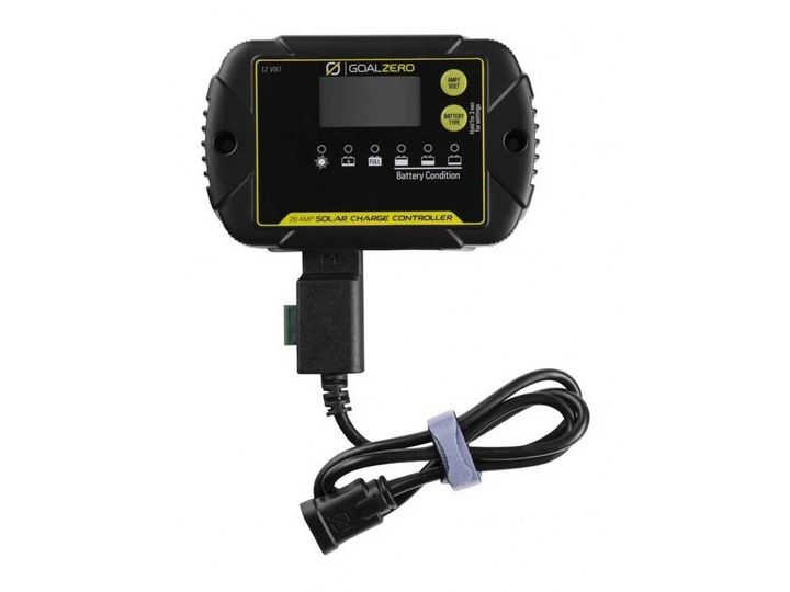 20 AMP CHARGE CONTROLLERMonitor and regulate solar input for 12V batteries with the 20 Amp Charge Controller. Designed to integrate seamlessly with Goal Zero solar panels, the charge controller comes with a pre-installed High Power Port and an easy-to-read LED screen. Equipped with an IP65 rating, the charge controller is weather resistant and dustproof, allowing for protection against the elements when powering off-grid adventures or outdoor equipment