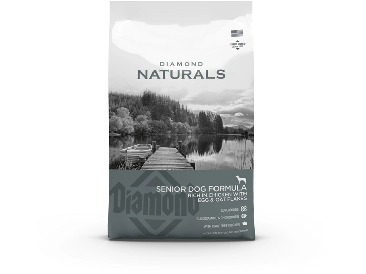 Diamond Naturals Senior Dog foder med kylling, æg og havreflager. Et komplet foder til ældre hunde. Nøje udvalgt protein og fedt for at  imødekomme den ældre hunds behov. Indeholder fibre der fremmer fordøjelsen. Glukosamin og condroitin fremmer sunde led, Superfoods, selen og E-vitaminer giver gode  antioxidanter.