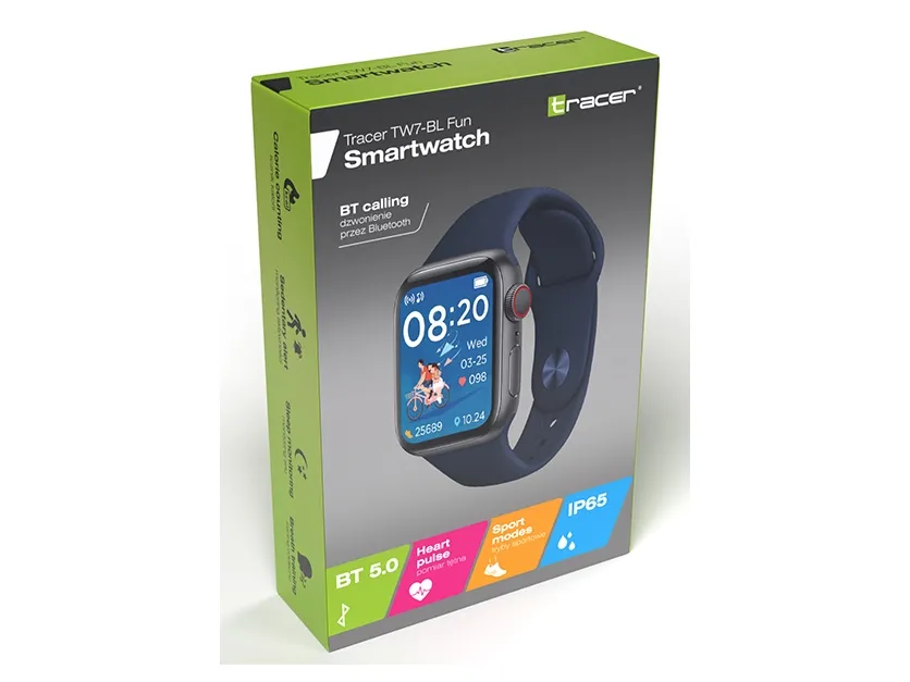The Tracer Fun TW7 smart watch combines style and function, designed for those who value both aesthetics and performance. With a sleek rectangular case and a vibrant 1.83-inch color display, the watch is equipped with a range of features that cater to fitness enthusiasts and everyday users. Enjoy the convenience of hands-free communication through its microphone and speaker while receiving notifications through SMS and incoming calls directly on your wrist. With advanced sensors like a pedometer, heart rate monitor, and pulse oximeter, the TW7 provides in-depth tracking of all your daily activities including distance covered, calories burned, and sleep stages. The rechargeable cobalt polymer battery offers lasting power, making it the perfect companion for both workouts and daily tasks. Additionally, the watch is water-resistant with an IP65 rating, ensuring durability in various conditions. Keep track of your health goals with features like a drink reminder, breathing training, and sedentary lifestyle alerts, making it easier to stay on top of your fitness and well-being.