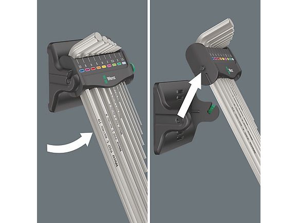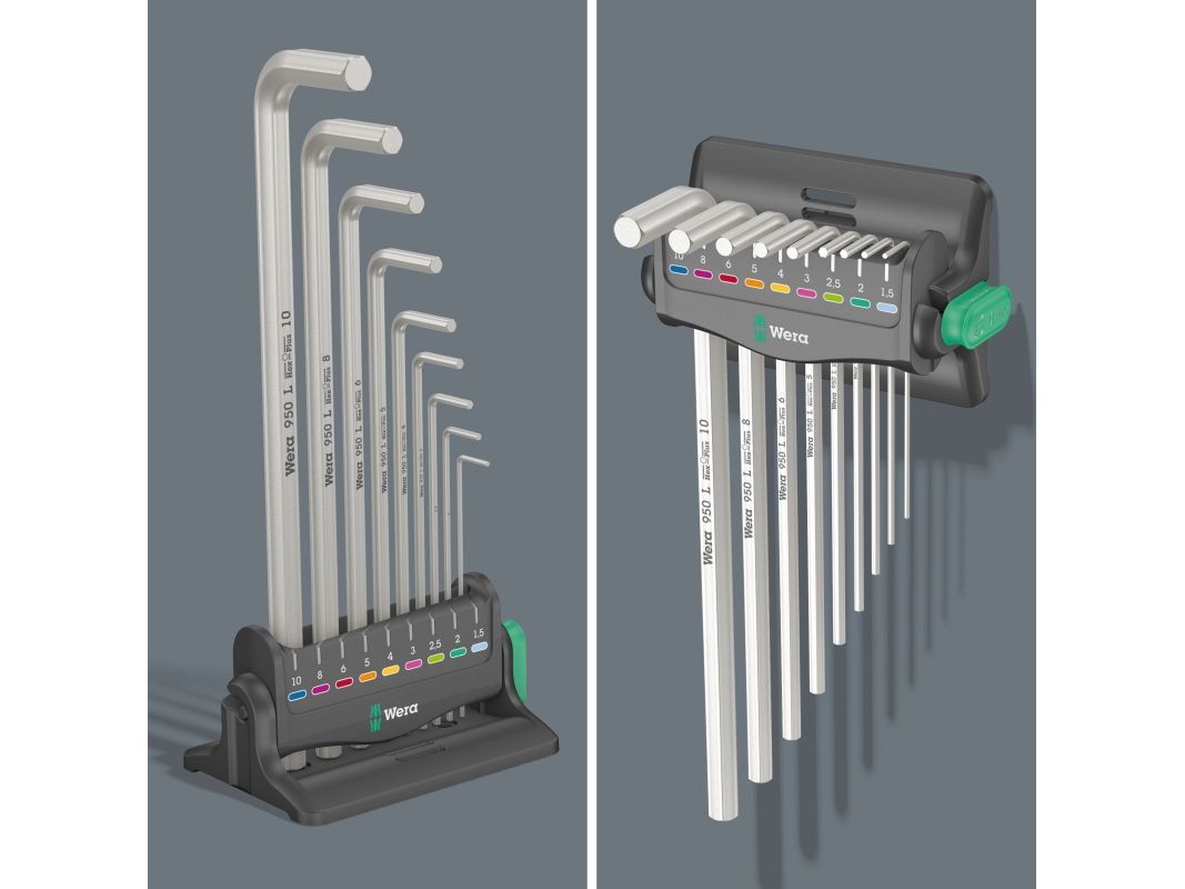 9 forkrommede vinkelnøkler med Hex-Plus-fortrinn mot rundskrudde skruer sørger for et solid verktøysortiment til skruer med innvendig sekskant.