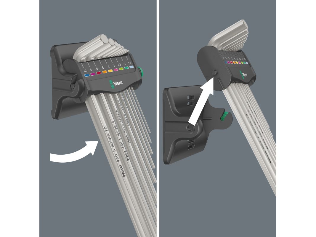 Prikken over i-en er den praktiske oppbevaringen i rack som kan plasseres på bordet eller festes på veggen. Rack inneholder dessuten en smart avtagbar magnetiserer som kan brukes til å magnetisere (og avmagnetisere) skruer og verktøyspisser. Dermed trenger du ikke lenger å holde fast skruen med den andre hånden.