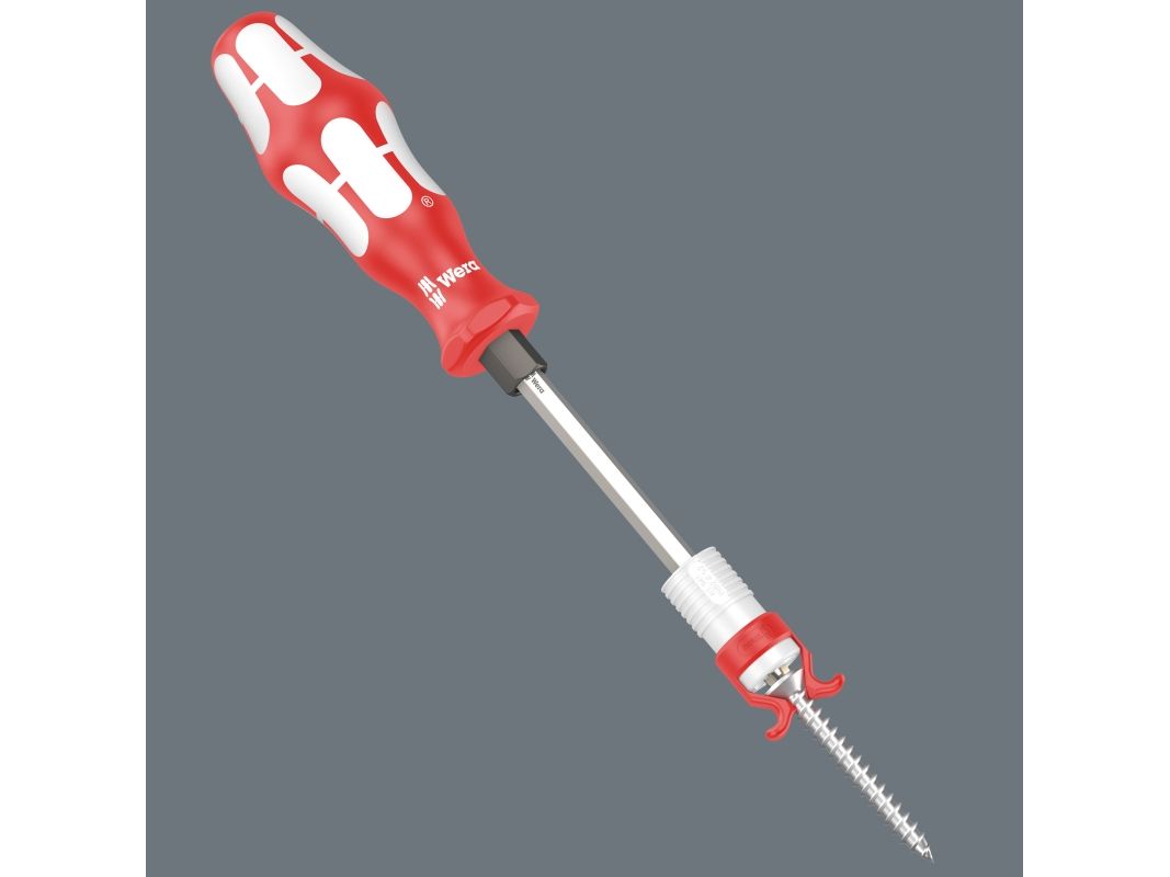 Den særdeles praktiske skrueholderen er veldig kjekk å ha: Etter at den er satt på skrutrekkerklingen kan skruene holdes fast slik at du slipper å sikre skruen med den andre hånden under arbeidet.