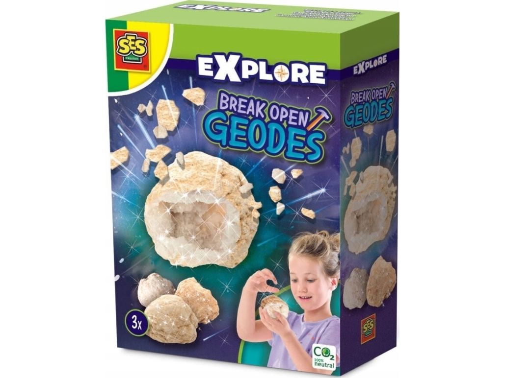 Discover real geodes! Have you ever seen a real geode? With this set, you can discover and break open geodes yourself. Put the geodes in a bag and break them apart with a hammer. Now you can see what's hidden inside the stone. Be enchanted by the real crystals that appear! The set contains three geode stones, a bag and instructions. Hammer not included.SES Creative Break open geodes - Real geodes to break open yourself, Beautiful crystals hidden inside, Age 8+. Product type: Experiment kit, Theme: Geology, Recommended age (min): 8 yr(s)