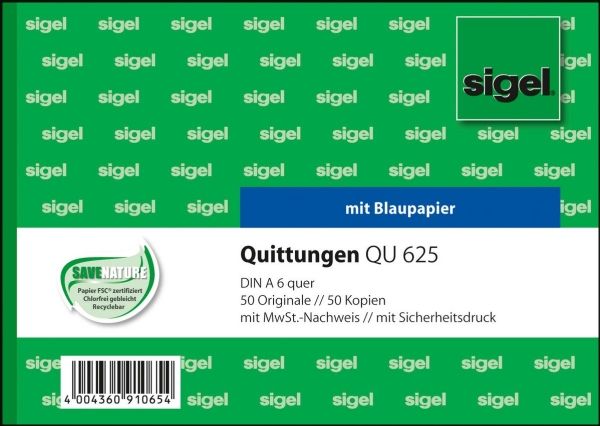 The Sigel QU625 receipt pads offer an efficient solution for managing receipts. With a format of A6 (105 x 148 mm), each pad features 50 sheets that are microperforated for easy tear-off. The wood-free paper ensures a clean finish, while the spine gluing adds to the durability of each pad. The carbonless design allows for clear duplicate prints, ideal for businesses that require copies of receipts without the mess of carbon paper. Compliant with ECF standards, these pads are designed for counterfeit-resistant document printing. The landscape orientation provides ample space for writing, ensuring that all necessary details can be recorded clearly. Perfect for any business needing reliable receipt documentation, the Sigel QU625 combines functionality with quality craftsmanship.