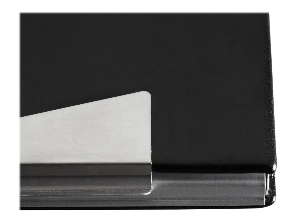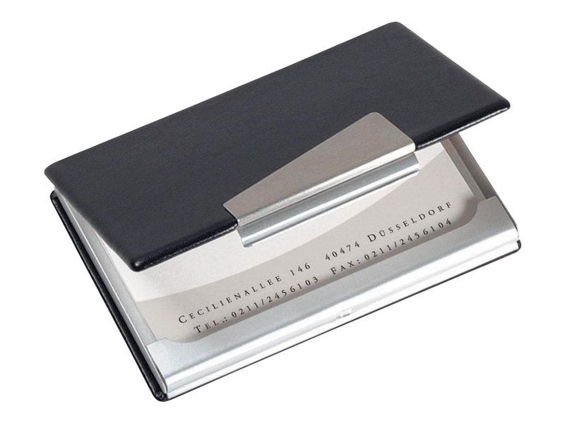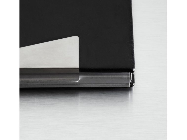 Classy business card case made of a high-quality combination of aluminium and imitation leather. Provides safe storage and perfect protection for cards. There is space for up to 20 cards (max. 91 x 58 mm) in the case. The outer dimensions are 95 x 65 x 12 mm (w x h x d).