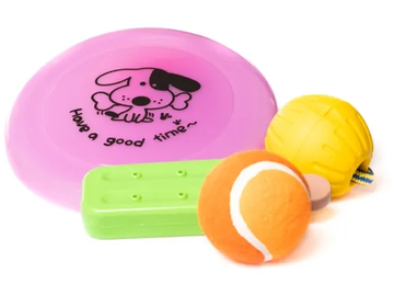 Hundelekeblanding, 4 stk (frisbee, ball på snor, tennisball, ispinne)